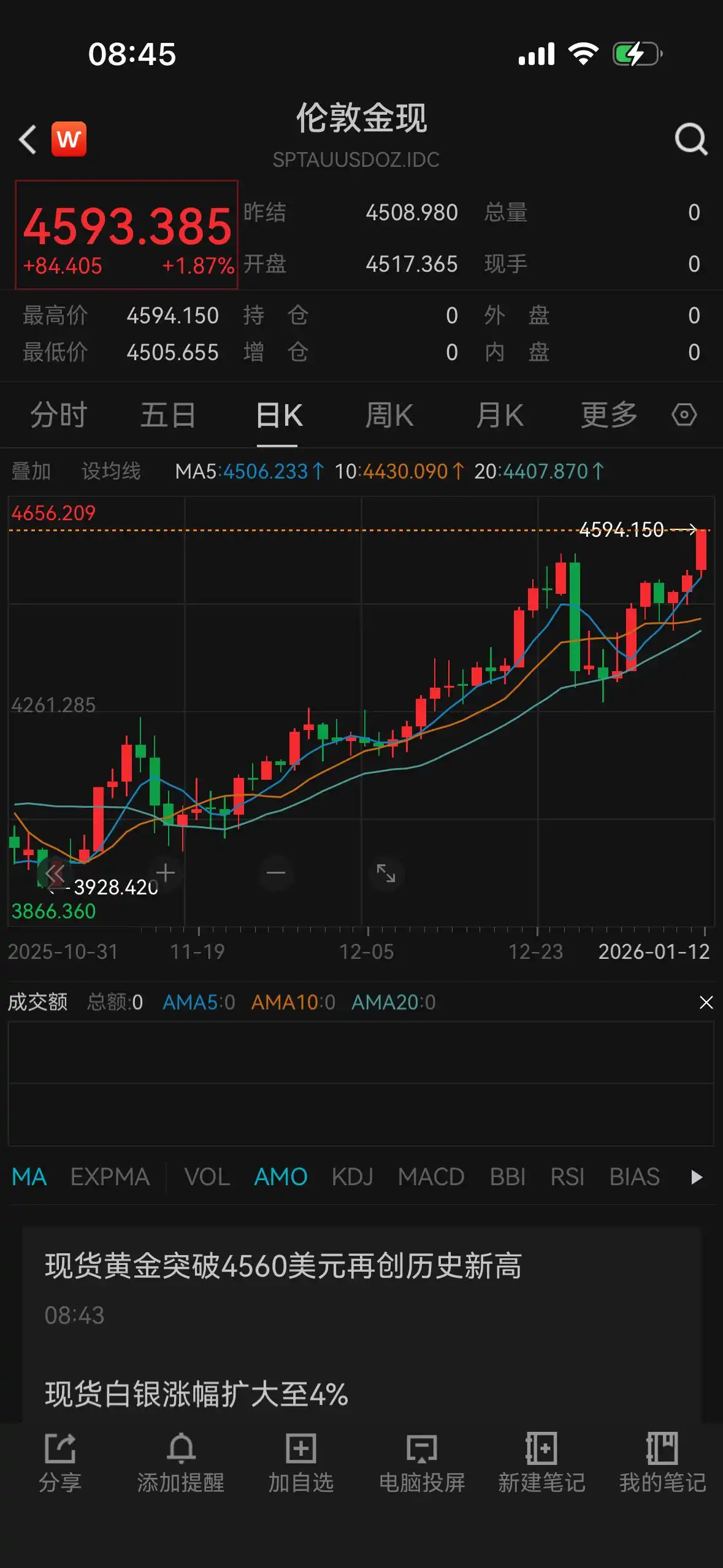 1月12日,贵金属价格狂飙。截至早上8点45分发稿时,现货黄金大涨1.87%,冲破4593美元/盎司,创出历史新高,现货白银更是涨超4.5%,站上83美元/盎司,接近于历史新高。