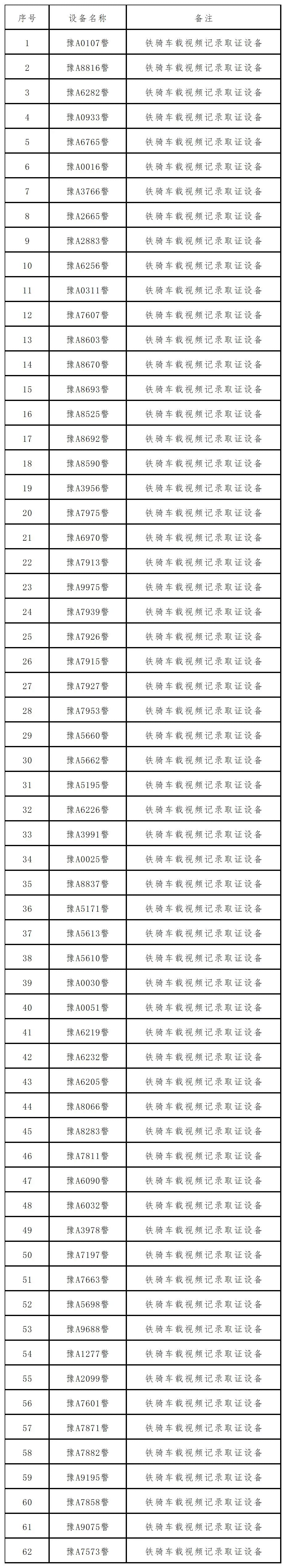 记者从郑州交警处获悉,为强化市区道路交通秩序管理,提高科技化管理水平,郑州市公安局交通管理支队在市区新增62套“铁骑车载视频记录取证设备”,今日(1月12日)起正式投入使用,现将这批新增设备信息予以公示。