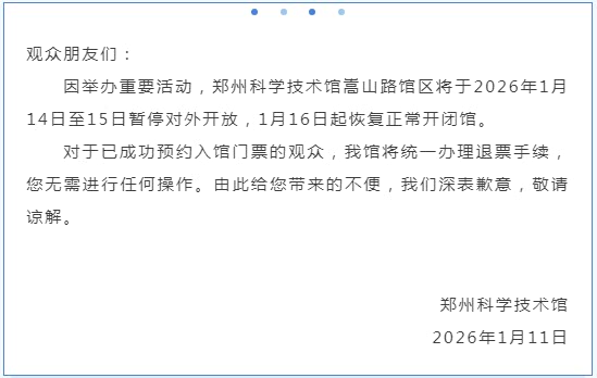 1月12日,记者从郑州科学技术馆获悉,嵩山路馆区将于2026年1月14日至15日暂停对外开放,1月16日起恢复正常开闭馆。