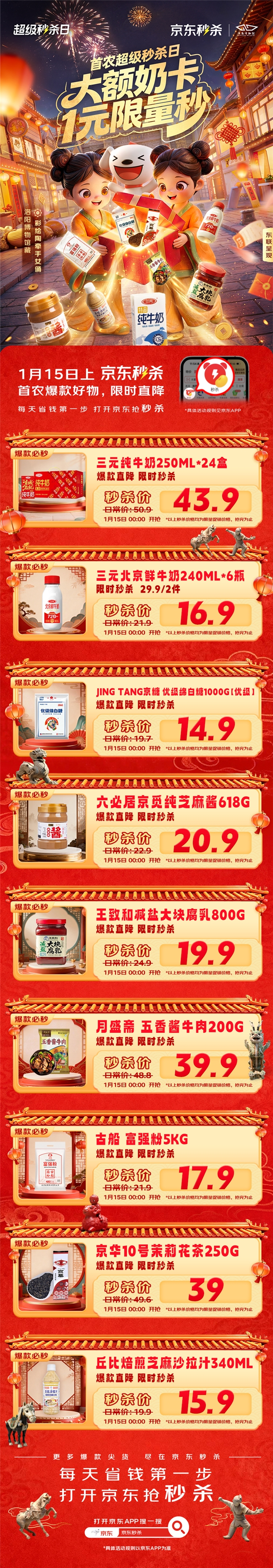 随着农历新年的脚步越来越近,年货采购迎来高峰期。为满足消费者对高品质年货的需求,1月15日,京东首农超级秒杀日开启,为消费者带来一场品质与实惠兼备的年货盛宴。活动当天,三元品牌奶卡限时1元秒杀,还有六必居京觅纯芝麻酱、月盛斋酱牛肉等众多首农旗下爆款好物价格直降,全方位覆盖消费者年货采购需求。