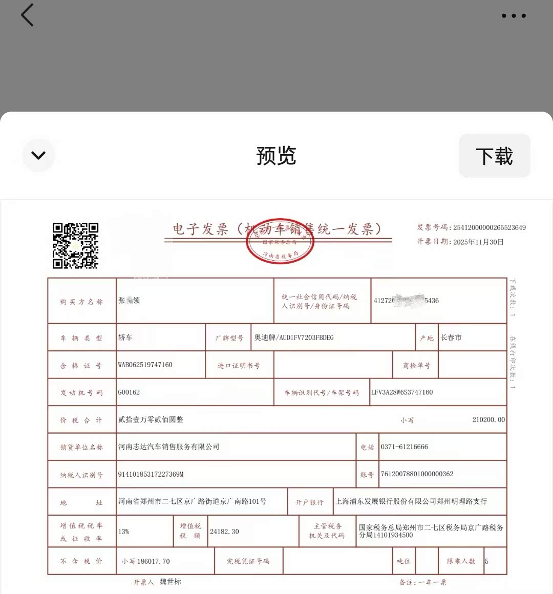 王先生介绍,2025年12月11日,其家中长辈王大爷在河南志达汽车销售服务有限公司全款购买了一辆奥迪A4L 2025款200万辆悦享版40 TFSI豪华动感型,并于12月13日完成提车。