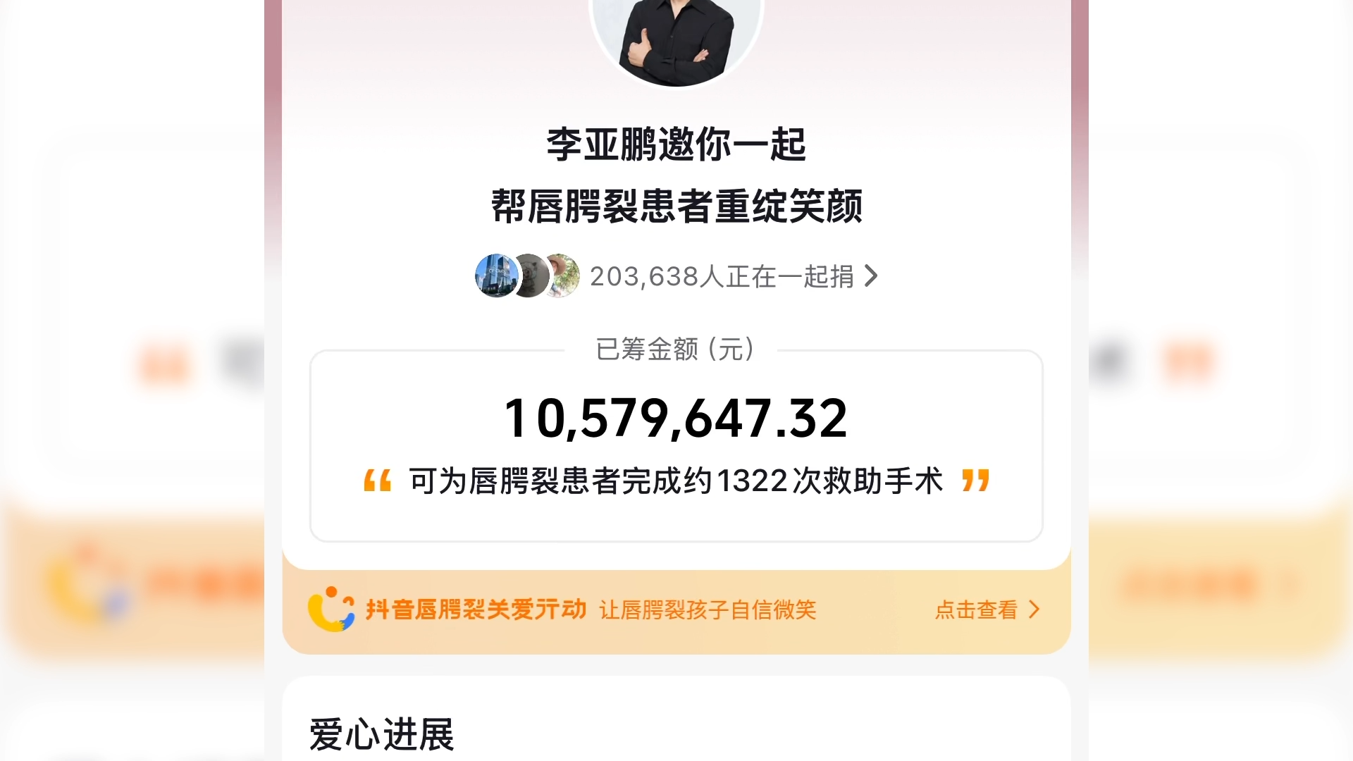 1月13日,由李亚鹏参与创办的北京嫣然天使儿童医院陷入租金纠纷一事被广泛关注。14日晚,李亚鹏发布31分钟长视频回应此事,“看有没有公益力量提供帮助,没了就关门,我的情怀大过了我的能力。”视频发出后,“给嫣然天使基金捐赠”成为社交平台搜索高频词。1月16日下午,大象新闻记者在“和李亚鹏一起做好事”的公益链接上看到,目前已有2042244人捐款,单笔捐赠金额最高的为6万元,总金额达1060多万元,能完成1300多次救助手术。
