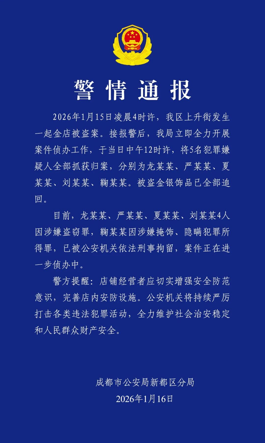四川省成都市公安局新都区分局1月16日发布警情通报:2026年1月15日凌晨4时许,我区上升街发生一起金店被盗案。接报警后,我局立即全力开展案件侦办工作,于当日中午12时许,将5名犯罪嫌疑人全部抓获归案,分别为龙某某、严某某、夏某某、刘某某、鞠某某。被盗金银饰品已全部追回。目前,龙某某、严某某、夏某某、刘某某4人因涉嫌盗窃罪,鞠某某因涉嫌掩饰、隐瞒犯罪所得罪,已被公安机关依法刑事拘留,案件正在进一步侦办中。警方提醒:店铺经营者应切实增强安全防范意识,完善店内安防设施。公安机关将持续严厉打击各类违法犯罪活动,全力维护社会治安稳定和人民群众财产安全。
