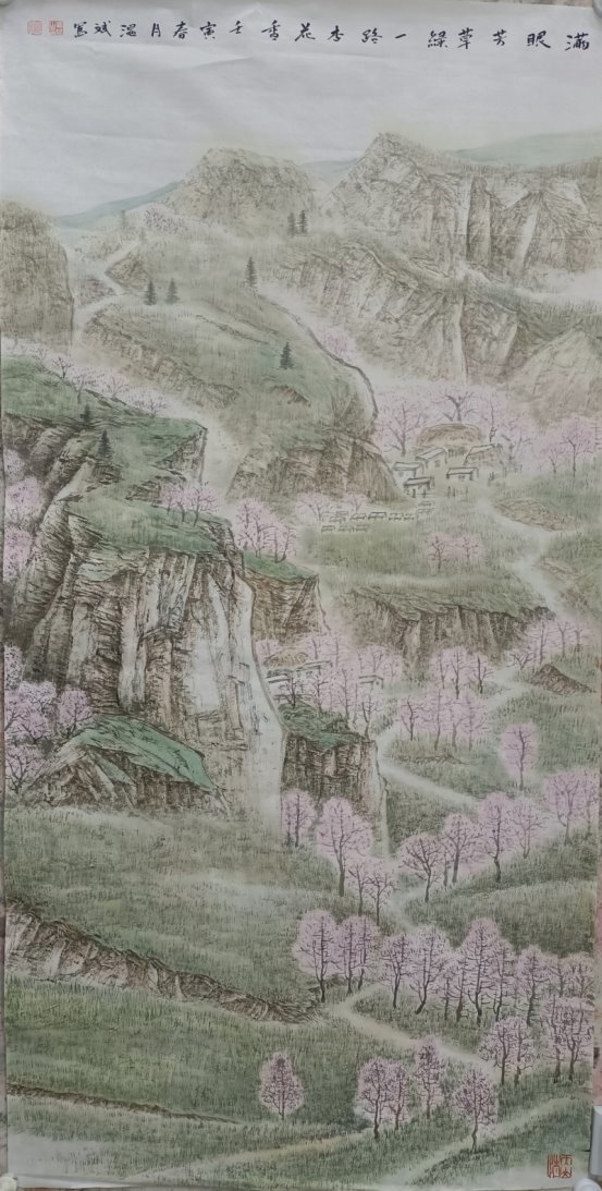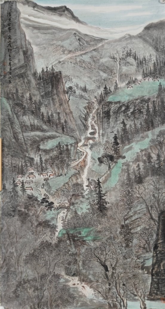 在《生态乡村入天山》《满眼芳草绿一路杏花香》等作品中,温斌展现了生态意识与传统山水精神的交融。他笔下的天山并非遥不可及的圣山,而是与人类生活和谐共存的生态空间。这种处理方式既承接了宋代山水“可居可游”的美学理想,又注入了当代的生态关怀。值得注意的是,温斌并未采用西方风景画的写实手法,而是运用传统山水画的散点透视与意境营造,创造出一种既真实又超越的边疆景观。这种创作方法表明,他并非简单地用国画技法描绘新疆风景,而是在进行一种语言转换——将边疆经验转化为山水画的美学词汇。