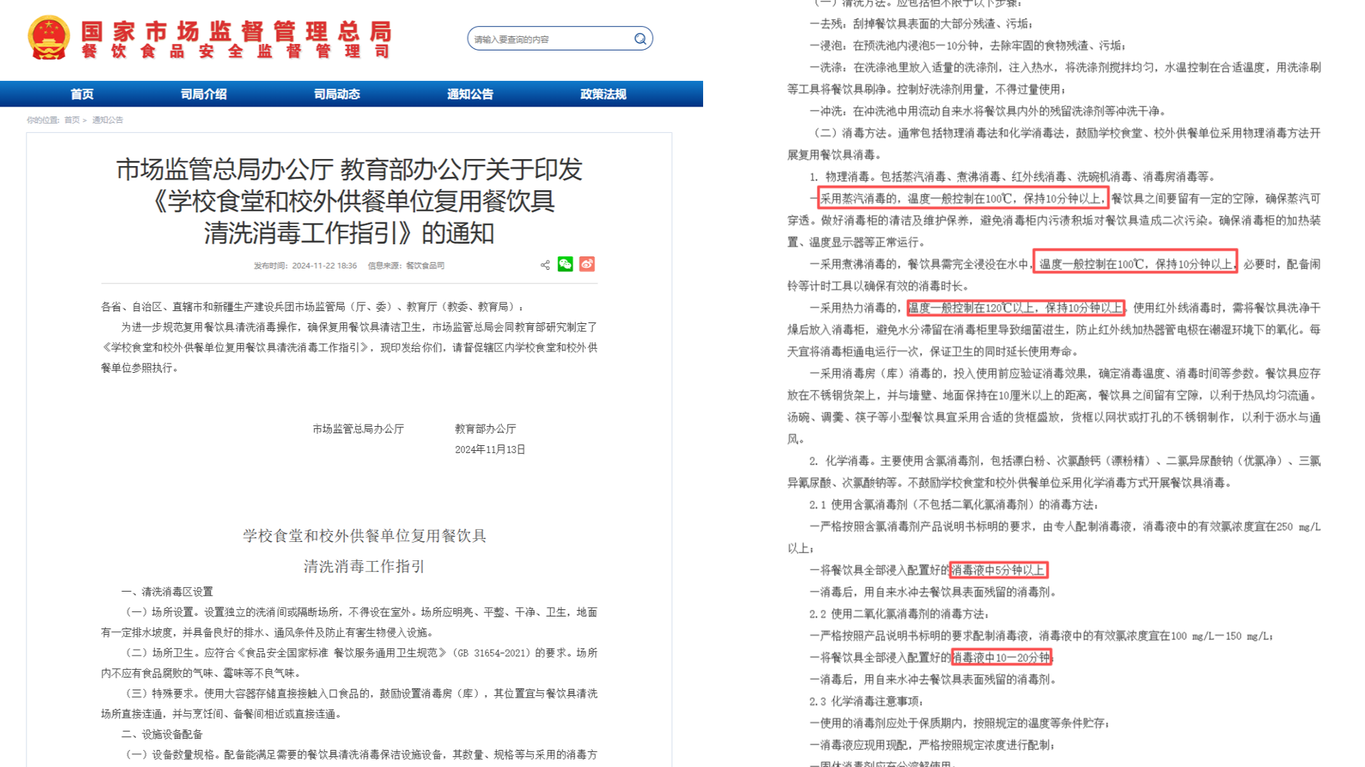 按照市场监管总局办公厅、教育部办公厅印发的《学校食堂和校外供餐单位复用餐饮具清洗消毒工作指引》(下称《工作指引》),复用餐饮具清洗消毒操作有着明确的步骤和流程,其中消毒分为物理消毒和化学消毒。无论是物理消毒,还是化学消毒,《工作指引》中都有明确的消毒标准和消毒时间。