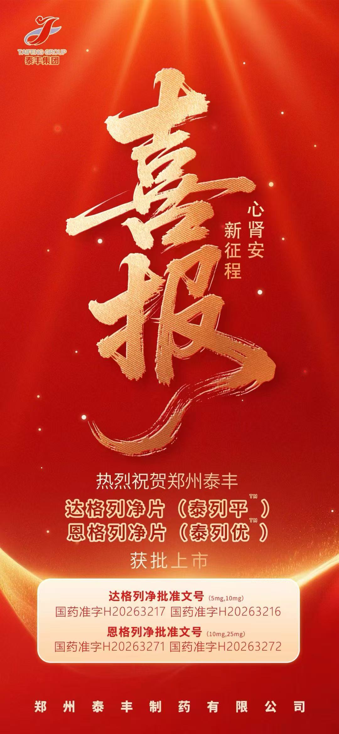 郑州泰丰制药达格列净片、恩格列净片双双获批上市 。泰丰集团降糖硬核品种双剑齐发,心肾同护,助力糖友稳糖、护心肾,共启健康生活新篇章!