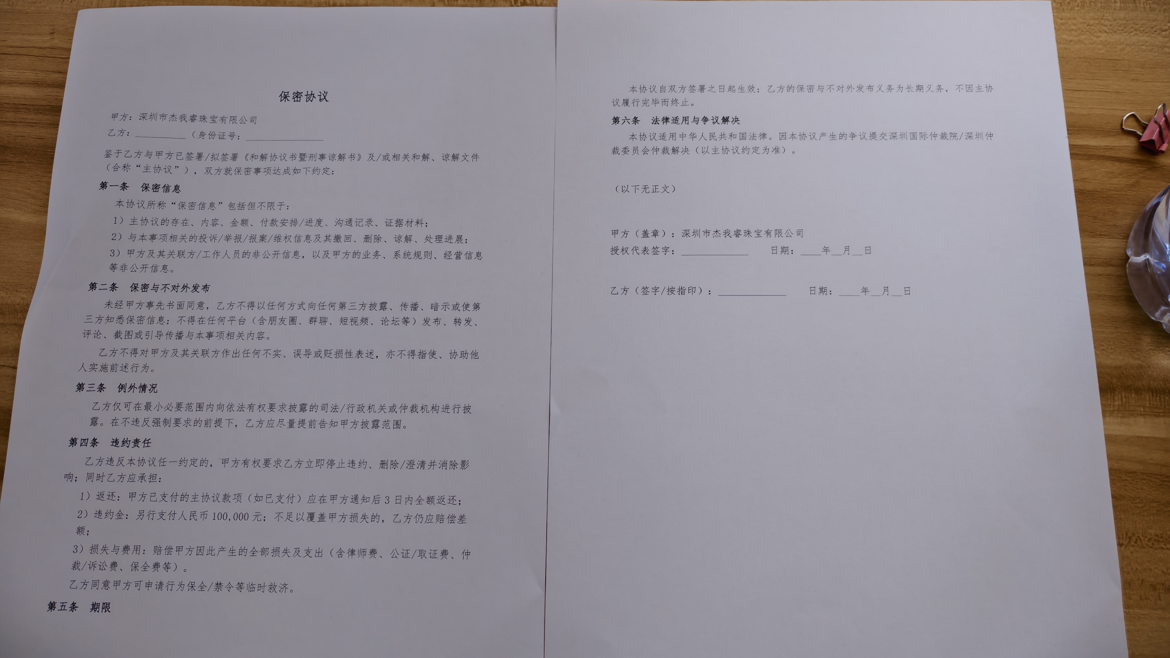 协议中包括:“不能再在网络上、私下提及任何与杰我睿相关事宜,被平台发现,承担10万元的赔偿责任;用户签署协议后,不再以任何形式向任何司法机关、行政机关对相关人员提出刑事控告、举报或要求追究刑事责任;如进入刑事程序,本人(指签署谅解书的受害用户)请求司法机关在审查处理本案时,对相关人员依法从轻、从宽处理。建议依法不予追究、作出不起诉处理,或依法适用不批准逮捕、缓刑等非羁押或从宽措施。”等内容。
