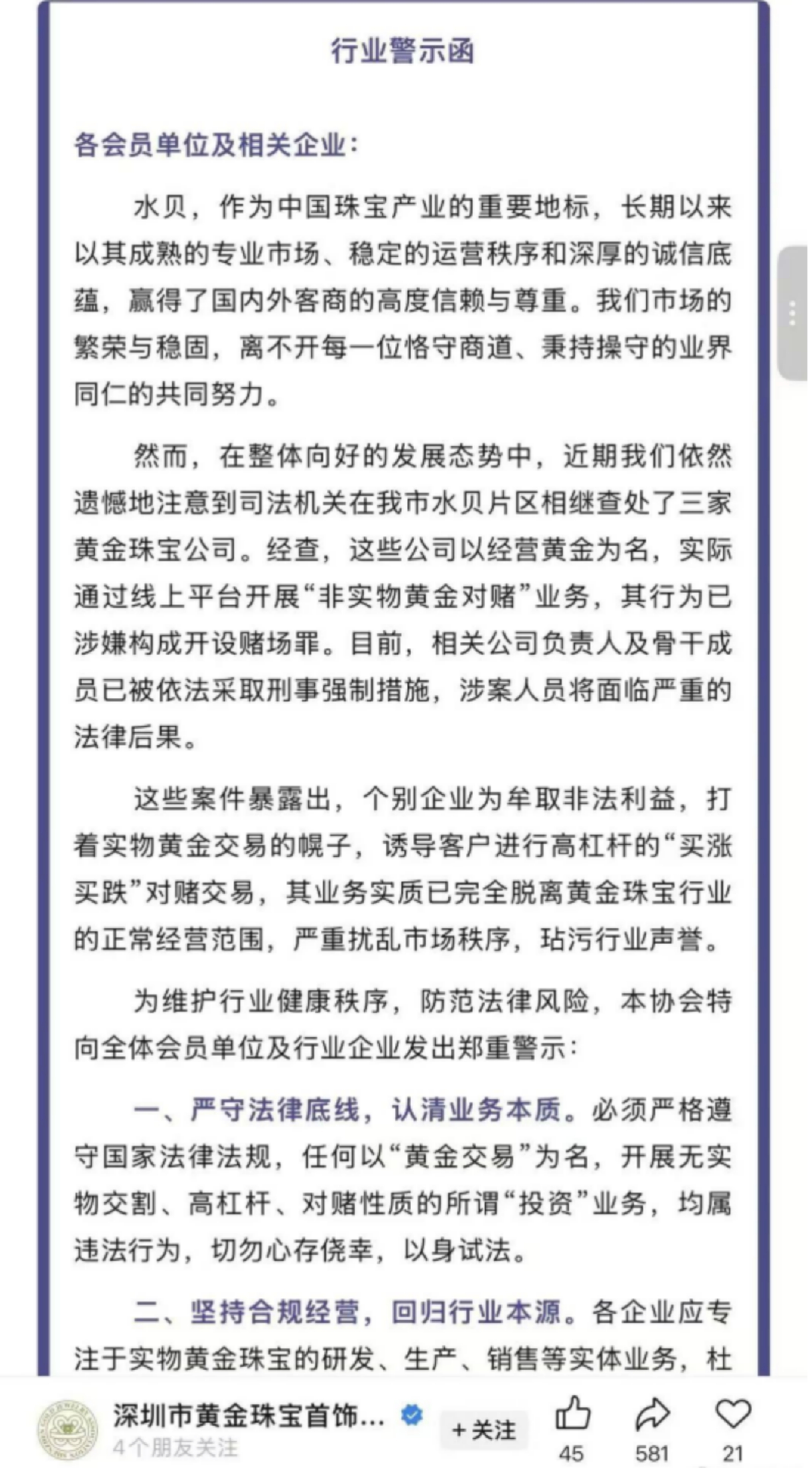 而在去年10月,深圳市黄金珠宝行业协会曾发布行业警示函称:个别企业打着实物黄金交易的幌子,诱导客户进行高杠杆的“买涨买跌”对赌交易;司法机关近期查处了三家黄金珠宝公司,通过线上平台开展“非实物黄金对赌”业务,其行为已涉嫌构成开设赌场罪。