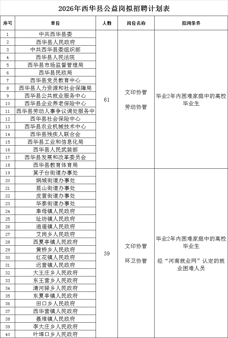 西华县2026年公益性岗位招聘