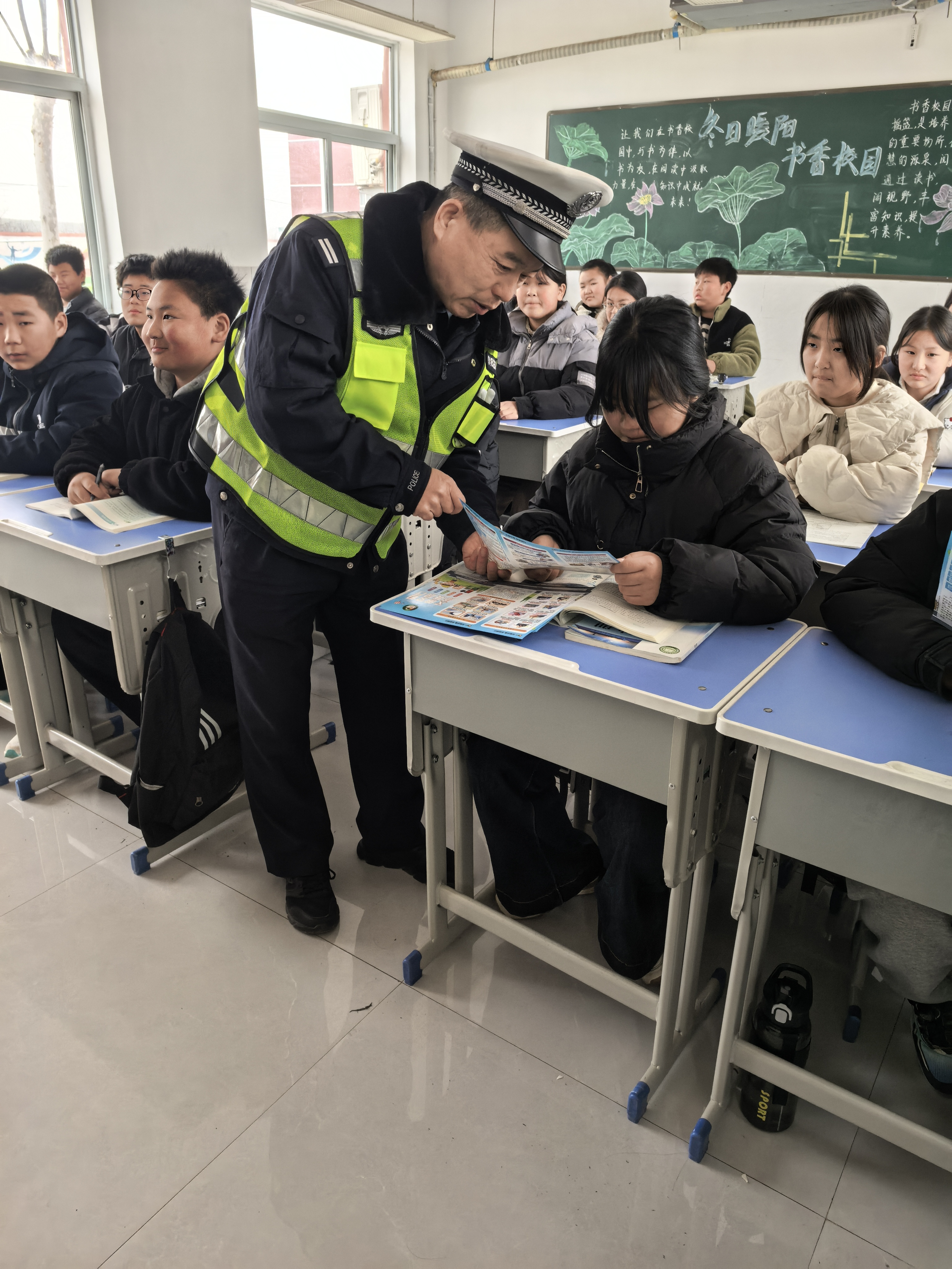 活动中,民警结合学生日常出行特点,通过现场讲解、互动问答、发放宣传页等多种形式,用通俗易懂的语言向学生普及步行、骑行、乘车的安全常识。交警提醒同学们,冬季穿着厚重,帽子、围巾可能遮挡视线和听力,“过马路一定要先观察,做到‘一看、二慢、三通过’”。同时,民警细致讲解了如何安全行走、乘车时为何不能将头手伸出窗外、为什么要远离大货车盲区等知识,并结合真实案例,阐述逆行、闯红灯、多人骑乘电动车、“炸街”等行为的严重危害。