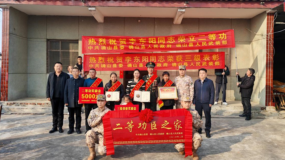 “李东阳同志在2025年度工作中因成绩突出,分别荣立个人二等功并荣获三级表彰,特此报喜!恭喜你们!”李峰向李东阳及其家属表示热烈祝贺,并感谢李东阳的母亲为国家培养了一名好军人、为部队送去了一个好人才。
