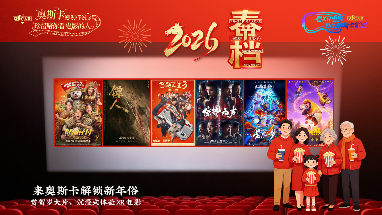 据奥斯卡院线提供片单,《飞驰人生3》、《镖人:风起大漠》、《惊蛰无声》、《星河入梦》、《熊猫计划之部落奇遇记》、《熊出没·年年有熊》6部新片蓄势待发,还有纪录电影《重返狼群》将于大年初三重映。著名导演与实力派演员强强联手,武侠、动作、悬疑、奇幻、喜剧、动画等多种类型百花齐放。群星璀璨贺新春,春节解锁院线贺岁大片,影迷可以到奥斯卡影城沉浸体验XR电影。