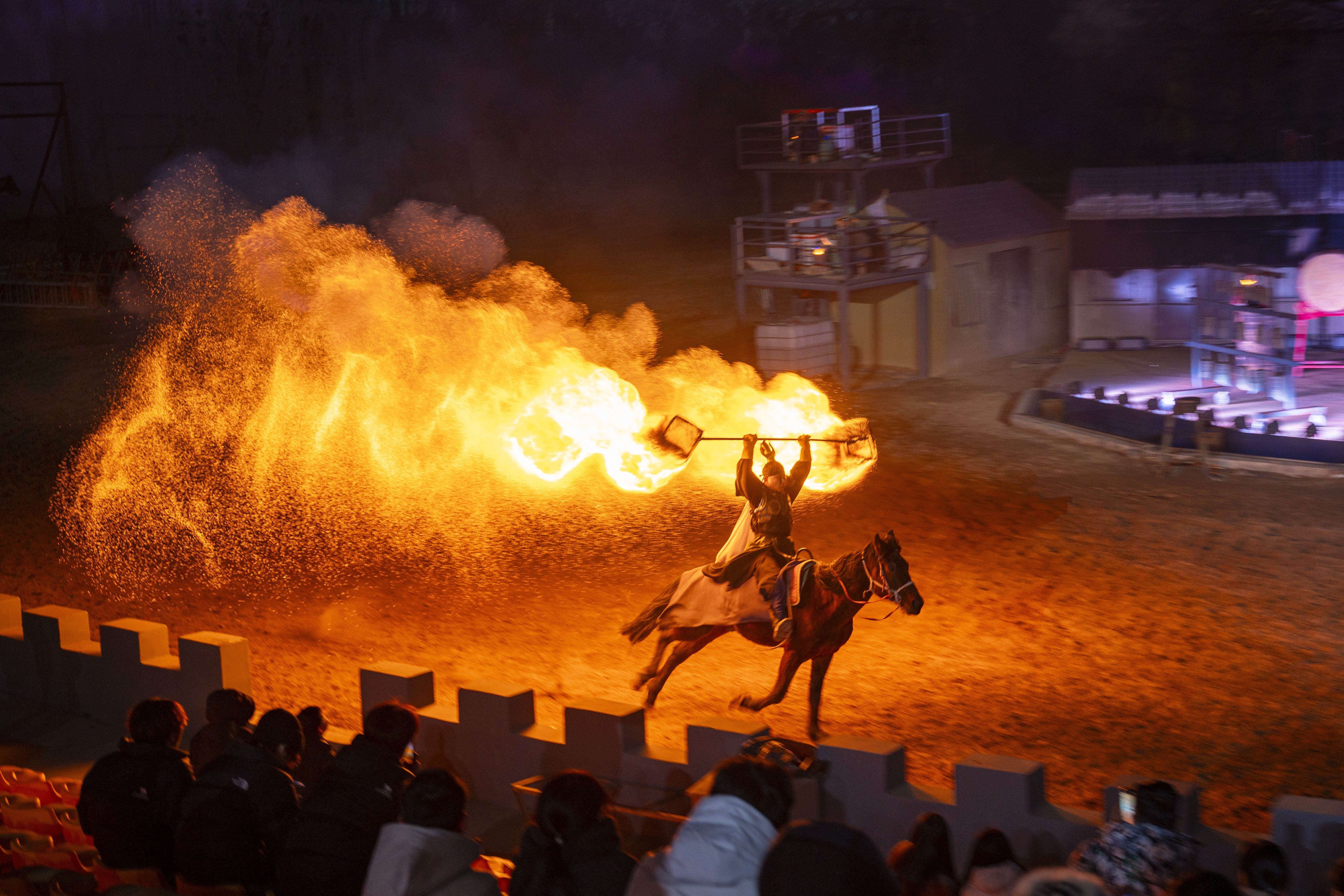 夜游的重头戏当属"牧野之战·打铁花"大型演艺。演出以商周牧野之战为历史背景,融合国家级非遗打铁花与实景马术,1600℃铁水飞溅如星雨,与舞台上的战马嘶鸣、刀光剑影形成视听共振,同时以现代高科技舞台特效,精彩刺激地展现中国战将独有的情怀和可歌可泣的精神。