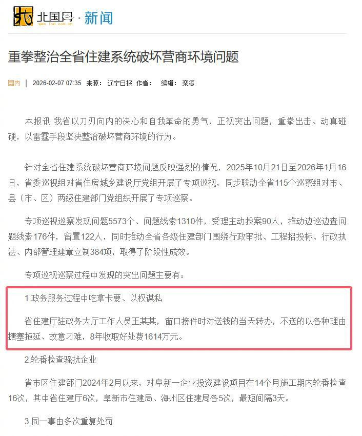 据《辽宁日报》2月7日报道,2025年10月至2026年1月,辽宁省委巡视组对辽宁省住房和城乡建设厅党组开展了专项巡视,同步联动全省开展了专项巡察。其中,辽宁省住建厅驻政务大厅工作人员王某某的案情尤为典型。他利用受理和转办审批材料的职务便利,明目张胆地实行“送钱当天办、不送钱就刁难”的办事规则,在八年时间里累计收受好处费高达1614万元。