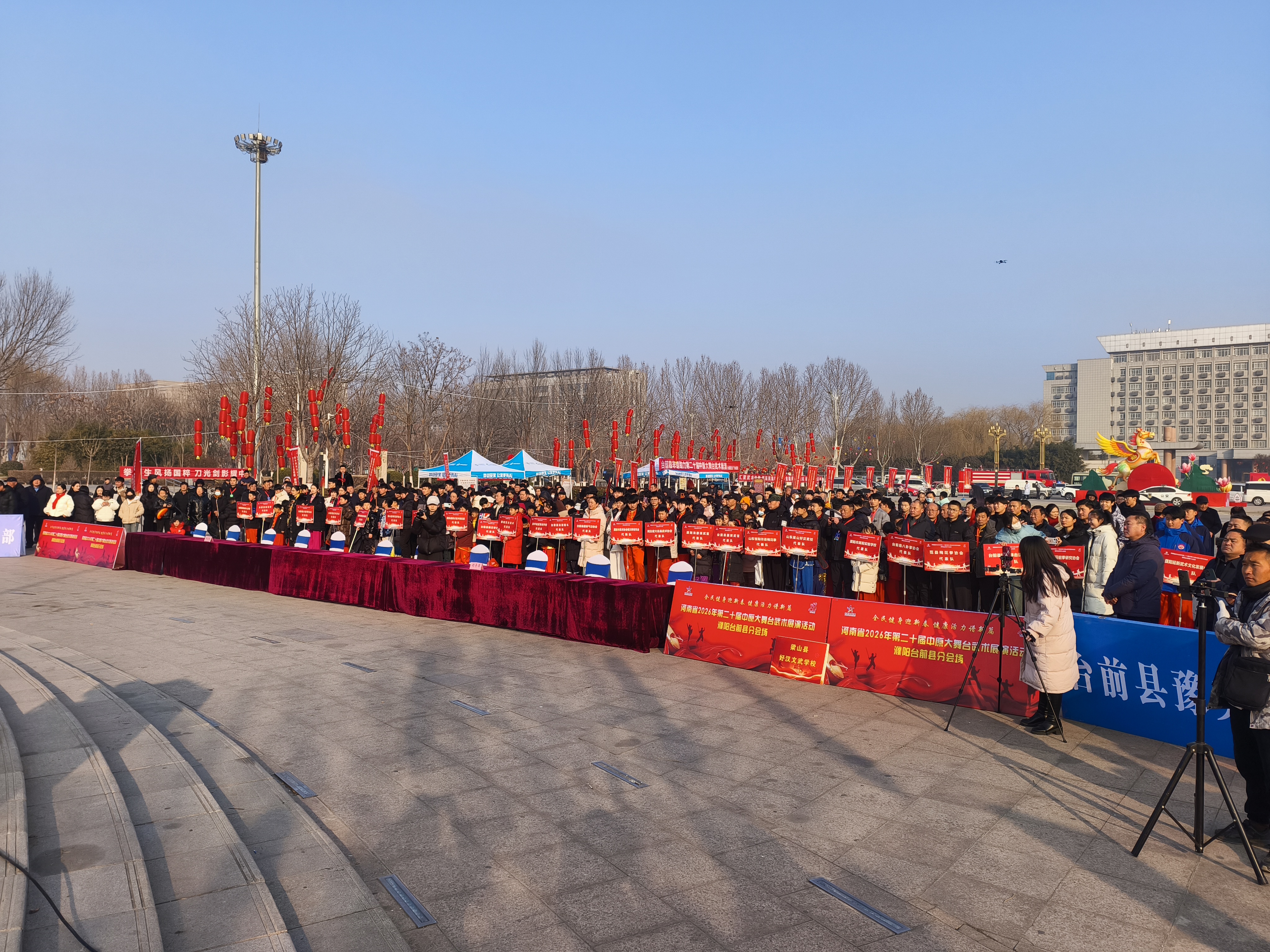 新春启岁,武韵飘香。为深入贯彻落实全民健身国家战略,丰富人民群众春节期间体育文化生活,2026年2月7日,河南省2026年“全民健身大拜年”系列活动暨第二十届中原大舞台武术展演活动台前县分会场在台前县市民广场隆重开幕。本次活动以“全民健身迎新春,健康活力谱新篇”为主题,汇聚冀鲁豫三省武术爱好者同台竞技、交流展示,为新春佳节增添了浓郁的体育文化氛围。