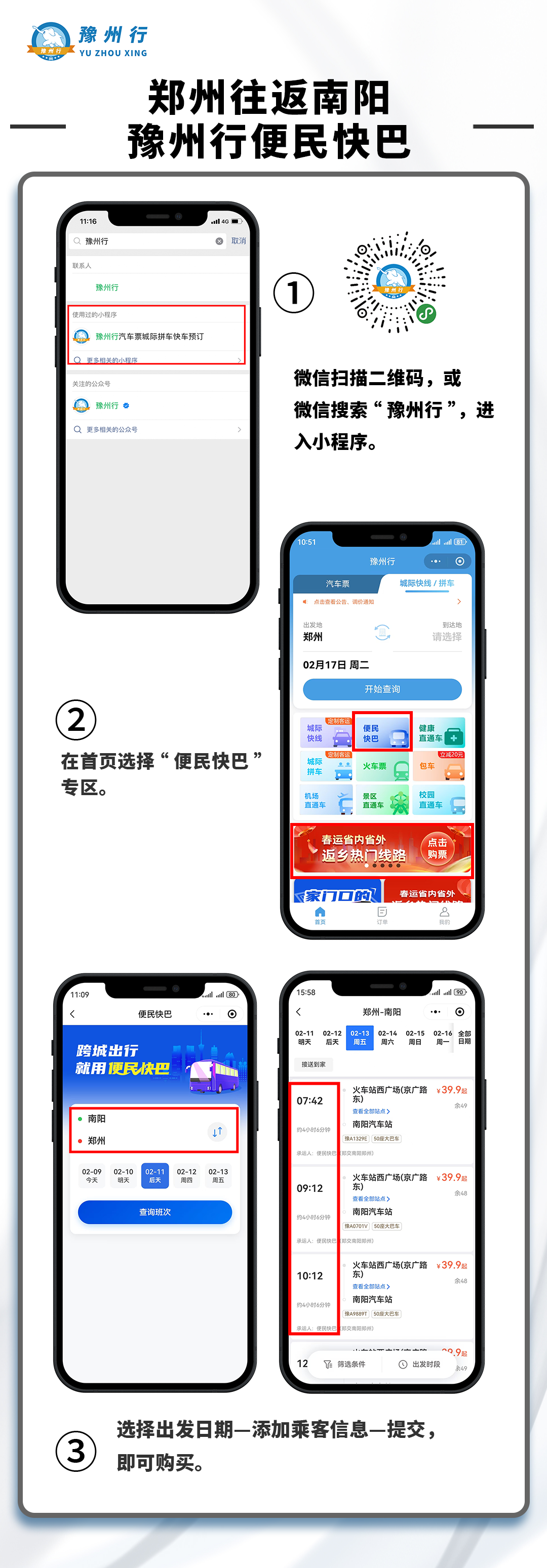 随着腊月二十六的临近,郑州往返南阳豫州行便民快巴已准备就绪,这条连接南阳与郑州的惠民线路,即将在春运最高峰期正式启航,在此也提醒广大返乡旅客,腊月二十六至除夕为春运客流最高峰,出行压力较大,建议大家提前1~2天通过线上豫州行微信小程序,“便民快巴”专区进行查询预订,合理安排出门时间,避免耽误行程,如有疑问,可拨打客服热线0371-96606!