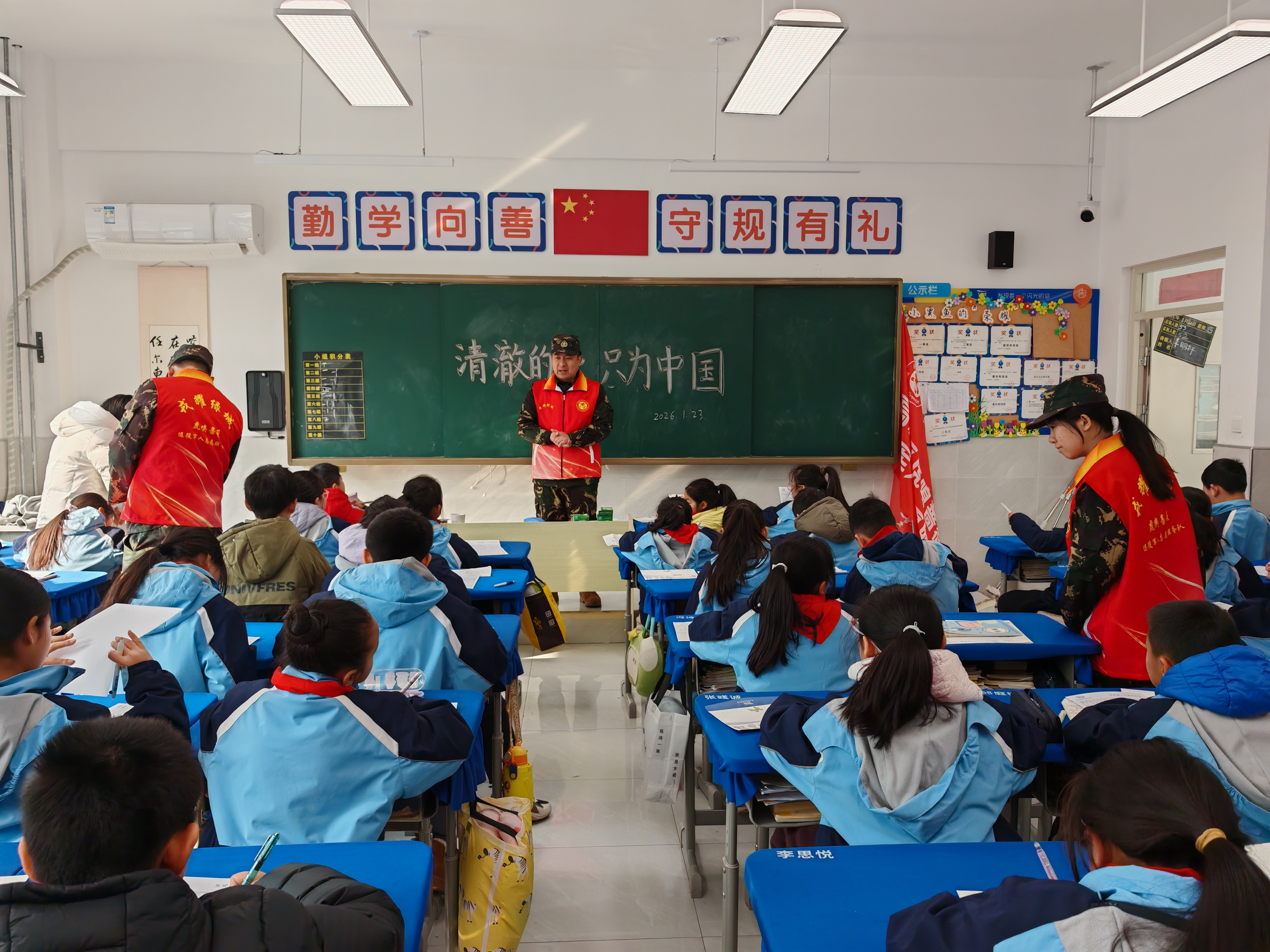 “是你们不分昼夜守护祖国,让我们能安心坐在明亮的教室里读书;是你们顶着漫天风雪驻守边疆,才有了我们幸福安宁的生活……” 拆开信封,西湖小学三三班张宸妍的字迹稚嫩却饱含深情,信纸背面,鲜艳的五星红旗旁,孩子们手绘的迷彩战士昂首挺立,朴拙的笔触里,是对边防官兵最纯粹的崇敬。这样的信件,高原官兵人手一封,每一封都承载着孩子们的赤诚心意,每一个字都如一束微光,照亮了高原的冬日,温暖了坚守的兵心。而这份藏在字里行间的真挚情感,正萌芽于志愿服务队走进校园的一堂国防教育课。