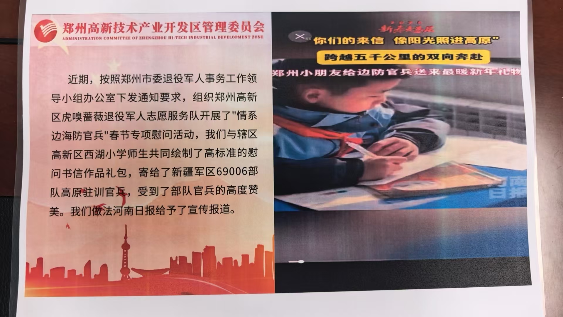一纸尺素,千里传情;军民同心,共护家国。这百封跨越山河的童信,是孩子与军人之间的情感纽带,是军民同心的生动写照,更是红色基因代代相传的鲜活载体。郑州高新区虎嗅蔷薇退役军人志愿服务队以退役军人的初心与担当,成为这份美好情谊的牵线人,让拥军爱国的情怀在雪域高原与中原大地之间生生不息,凝聚成军民同心、砥砺前行的磅礴力量,在新春的暖阳中,照亮守护家国的前行之路.