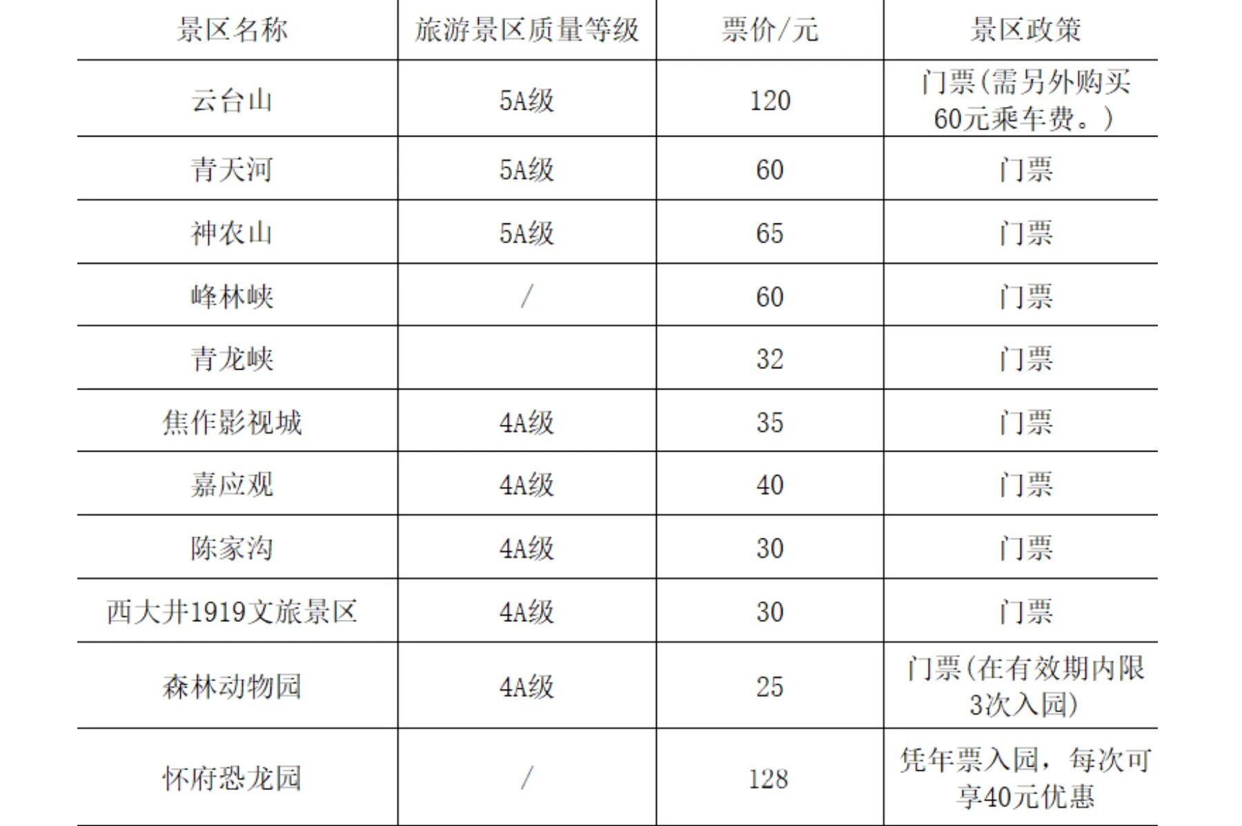 (三)纳入旅游年票的云台山景区每年7月、8月的周六、周日,五一小长假、十一黄金周及重大节庆活动暂停使用;青天河、神农山在五一小长假、十一黄金周及重大节庆活动时暂停使用;焦作影视城在五一小长假、十一黄金周、春节小长假及重大节庆活动暂停使用;森林动物园(在有效期内限3次入园)、陈家沟五一节小长假、国庆节黄金周、春节黄金周期间不可使用,景区重大活动期间不可使用(重大活动以焦作文旅公众号提前公告为准)。