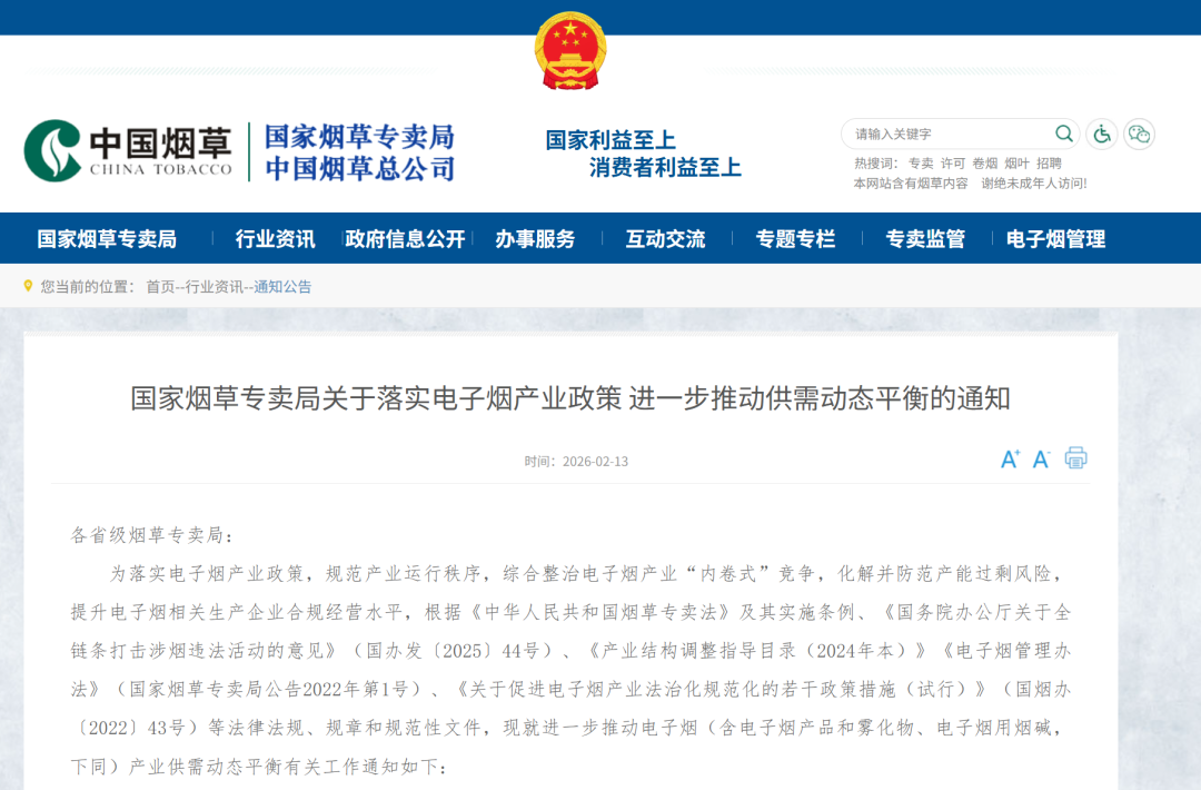 国家烟草专卖局官网13日发布《国家烟草专卖局关于落实电子烟产业政策 进一步推动供需动态平衡的通知》,全文如下: