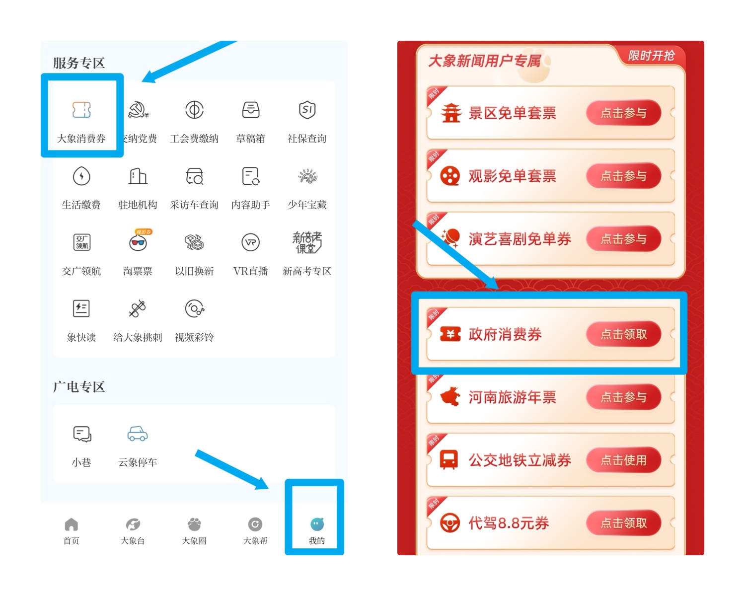 或点击“我的”—“大象消费券”领取
