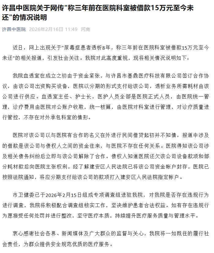 2月16日,许昌中医院发布关于网传“称三年前在医院科室被借款15万元至今未还”的情况说明:
