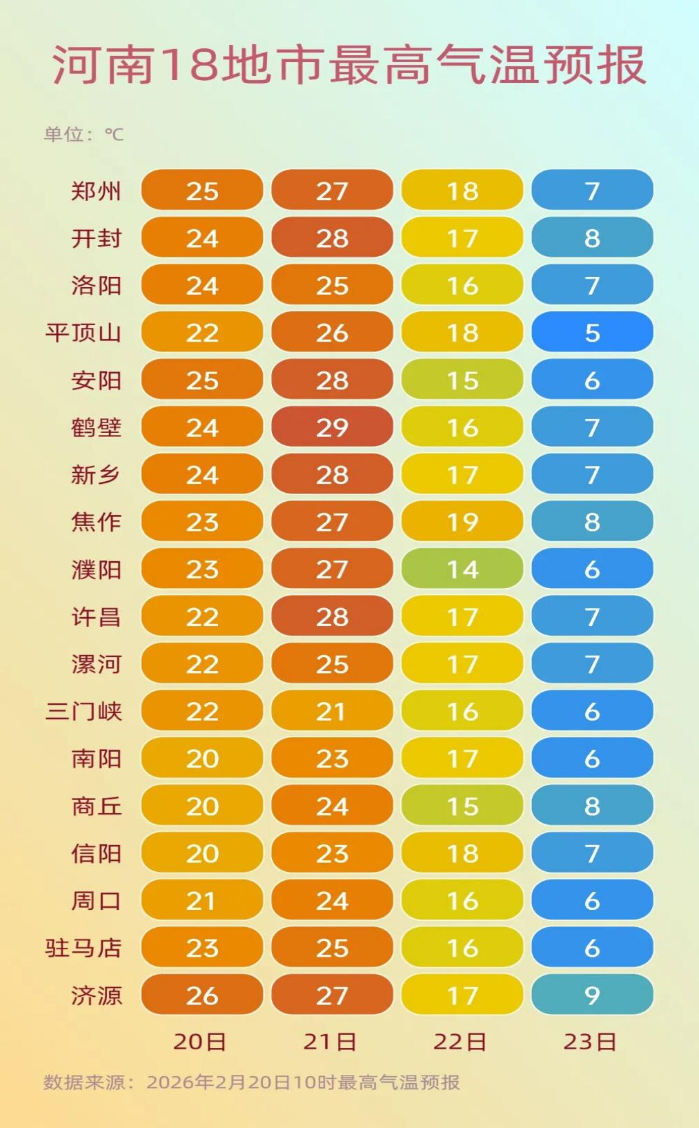 新年开场,晴朗上线,策马扬鞭式的大回暖也将开启!今天至初五我省将迎升温高峰,尤其是20-21日,大部地区最高气温直冲20℃+,21日是近期最高气温的顶点,比如郑州、安阳、开封等地市将达到或超过25℃,春天般的暖意扑面而来。最低气温也逐渐回升