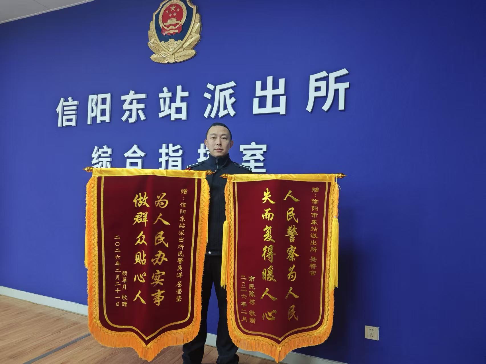 春运大幕开启,信阳东站客流持续高位运行,车站内外人潮涌动、步履匆匆。2月25日、26日,信阳东站派出所连续两天收到旅客千里邮寄而来的锦旗,两面锦旗均赠予民警吴洋,成为春运里一段温暖人心的佳话。