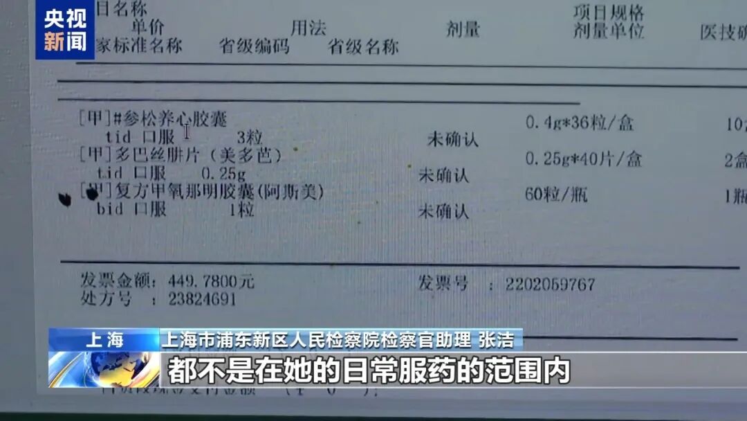 上海市浦东新区人民检察院检察官助理 张洁:我们可以看出她这一次开出来药的总金额是449.78元,自己现金支付了67.46元,国家医保统筹基金是支付了382.32元。