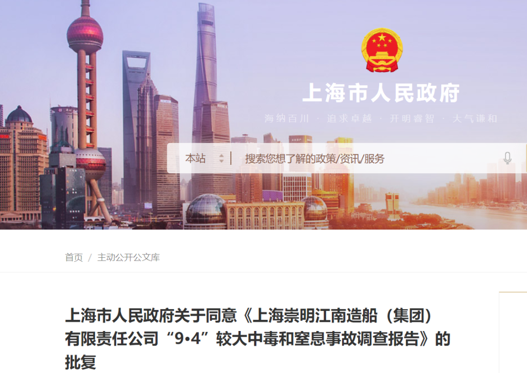 近日,上海市人民政府公布了关于同意《上海崇明江南造船(集团)有限责任公司“9·4”较大中毒和窒息事故调查报告》的批复。