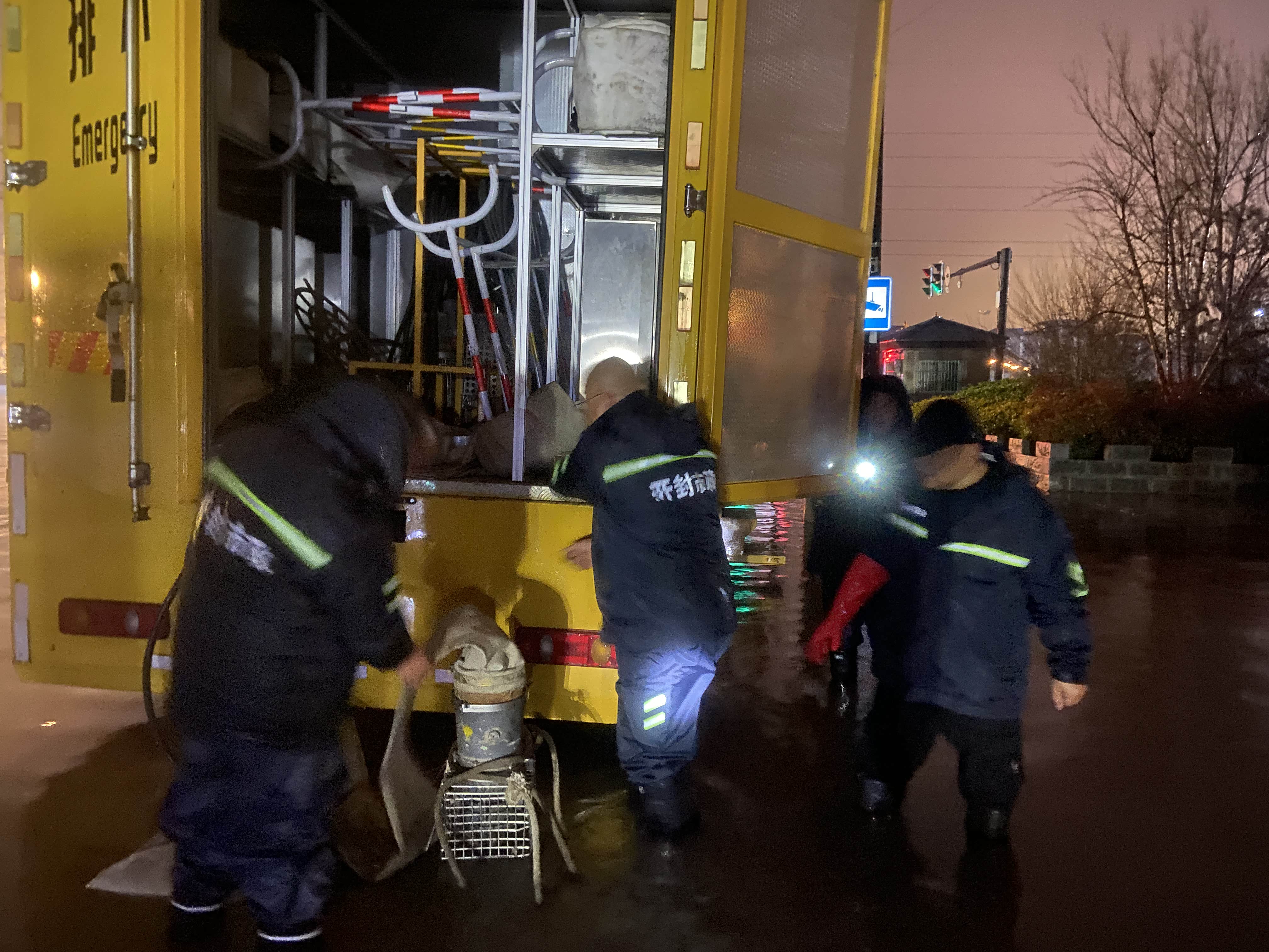 降雨开始后,防汛人员提前抵达各易积水点位,架设抽排设备并安排专人定岗值守,确保降雨期间能够第一时间启动设备。28日8时,降雨强度逐渐加大,大庆路、建安街等部分路段出现积水情况。夜间气温低至3℃,在接近零度的初春寒夜里,中心防汛人员不畏风雨、坚守岗位,彻夜奋战在排涝一线。工作人员第一时间在积水点位设置安全警示标识,同步打开井盖并放置“排水神器”,及时打捞井篦周边杂物,有效提升排水速度。同时结合现场积水实际情况,科学调度移动泵车、临时泵、“龙吸水”等移动抽排设备,全力加速道路积水抽排工作,及时消除各类安全隐患。
