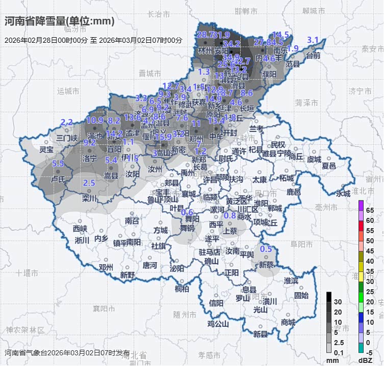 省气象台监测显示,2月28日0时至3月2日7时,全省出现小到中雨或雨夹雪,北部、中西部中到大雪,部分地区暴雪,局部大暴雪。全省平均降水量26.3毫米,地市平均降水量位列前三的分别为:濮阳45.5毫米、济源36.2毫米、开封34.6毫米;降水量位列前三的分别为:浚县55.9毫米、清丰50.6毫米、滑县49.3毫米。