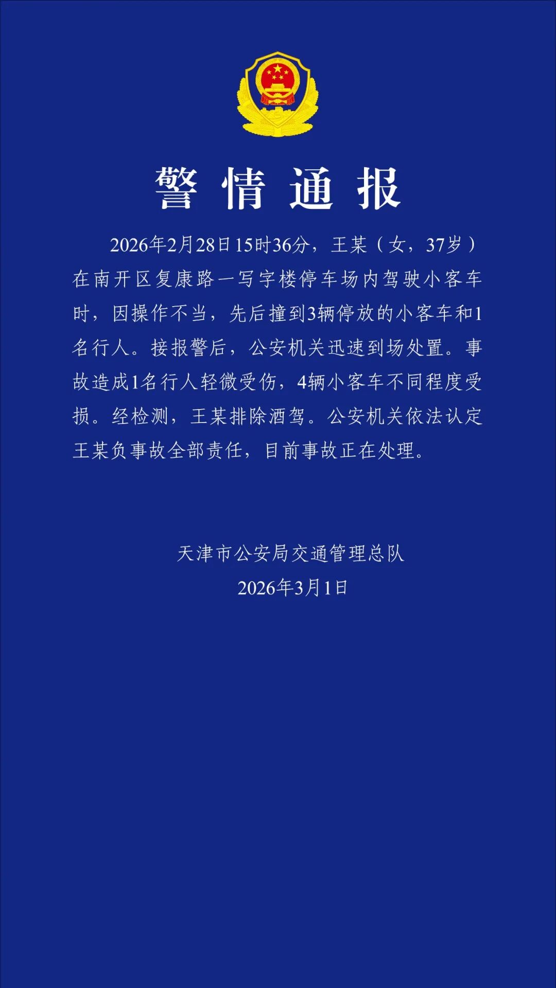 天津市公安局交通管理总队3月1日晚发布警情通报称,该市南开区一写字楼停车场内发生一起交通事故,造成1名行人轻微受伤,4辆小客车不同程度受损。