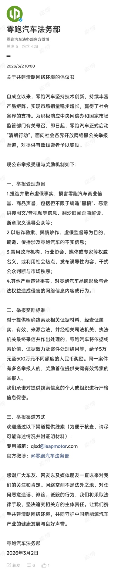3月2日,零跑汽车正式发布《关于共建清朗网络环境的倡议书》,宣布启动“清朗行动”,面向社会开放网络黑公关举报渠道,单条线索最高奖励达500万元。在国家持续深化“清朗行动”以及行业竞争日趋白热化背景下,零跑打响这场舆论阵地的“保卫战”,不仅是对有组织、有目的恶意抹黑行为的正面回击,更释放出其营造清朗网络环境的强烈决心。