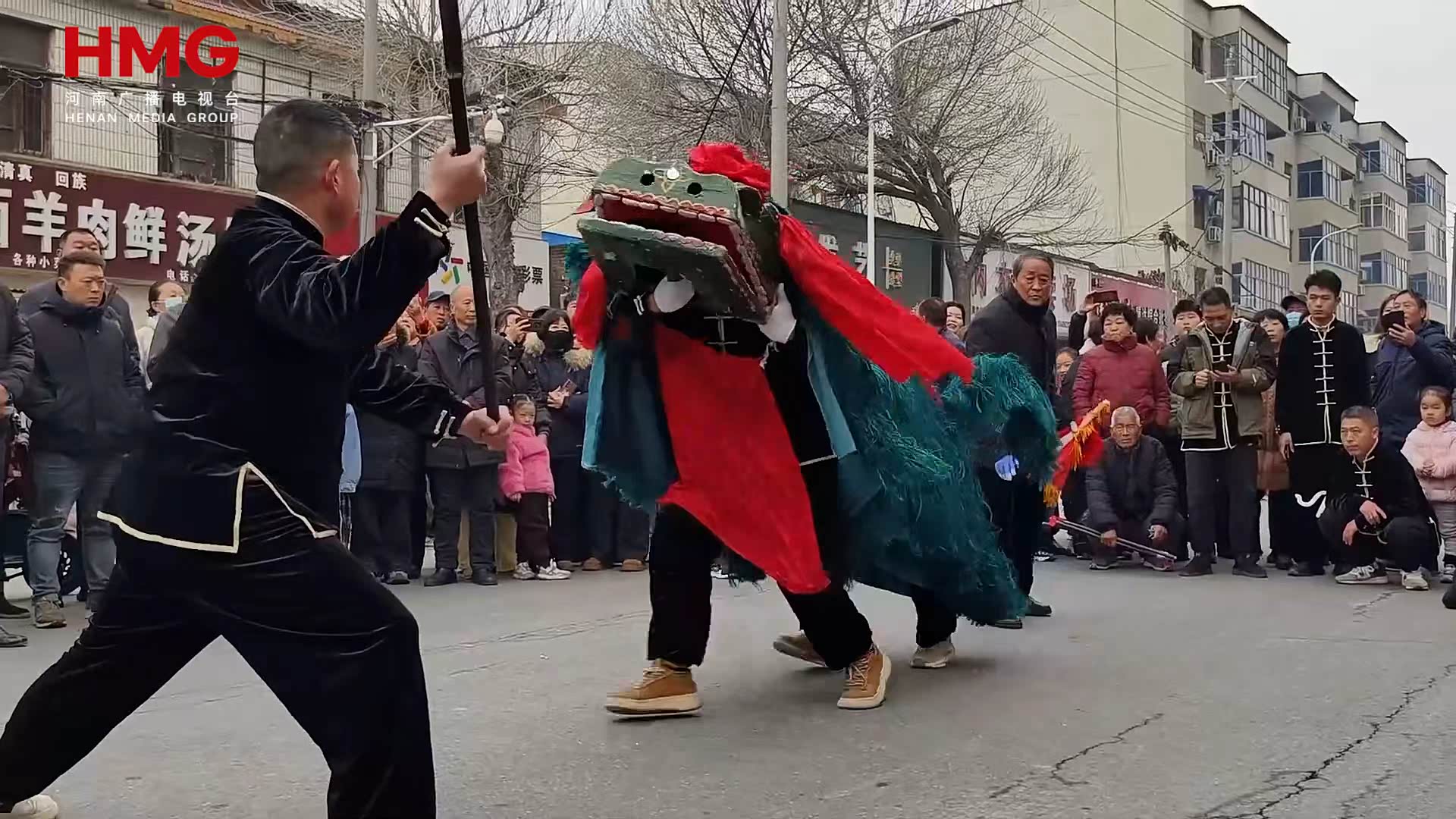 巡演现场,各类民俗节目轮番亮相,精彩不断。塔铺街道通郭村表演的《开明大鼓》气势如虹,这一延津独有、中原稀有的古老鼓乐距今已有近2000年的历史,2007年列入新乡市首批市级非物质文化遗产,代代相传的鼓谱配合铿锵的节奏,尽显豫北民间精气神;文岩街道的《哪吒传奇》武术表演刚劲有力,一招一式灵动飒爽,将经典民俗与武术魅力完美融合,成为现场一大看点;潭龙街道的《瑞狮闹鼓》以盘鼓配舞狮,鼓点浑厚,狮舞腾跃,喜庆氛围瞬间拉满,让现场观众大饱眼福的同时,也为群众献上一份新春美好祝愿。