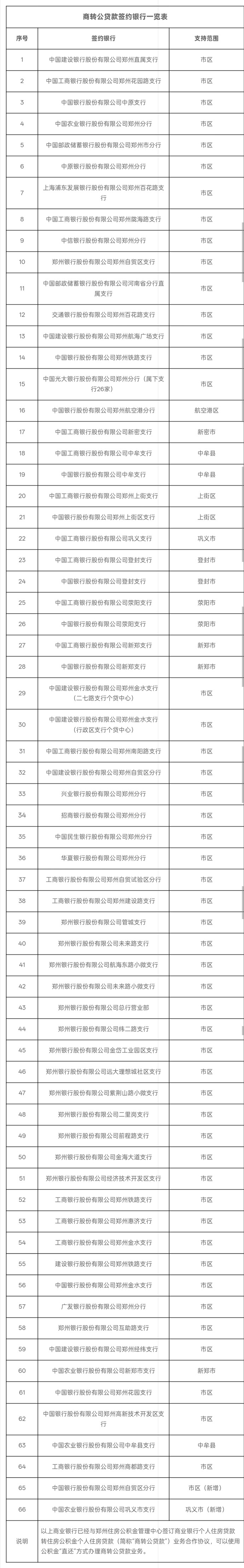 3月3日,郑州住房公积金管理中心发布公告,新增中国银行股份有限公司郑州自贸区分行、中国农业银行股份有限公司巩义市支行成为郑州住房公积金“商转公贷款”签约银行。截至目前,郑州共有66家银行支持商转公贷款直还模式。新增商业银行中,中国银行股份有限公司郑州自贸区分行支持范围为郑州主城区,商业银行出具“两函”(即《同意提前结清商业贷款函》和《同意办理顺位抵押函》)后,申请者可前往市政务服务中心、高新区政务服务中心、经开区政务服务中心公积金分厅进行办理商转公贷款业务。中国农业银行股份有限公司巩义市支行支持范围为巩义市区,商业银行出具“两函”,申请者可前往巩义市政务服务中心公积金分厅,使用公积金“直还”方式办理商转公贷款业务。
