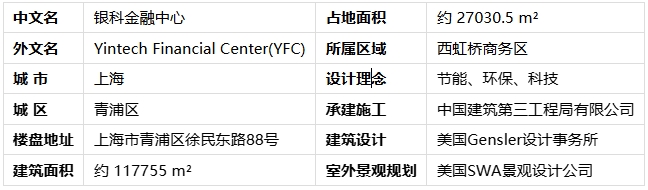 银科金融中心(YFC)位于上海市青浦区徐民东路88号 ,地处上海西虹桥商务区核心地段,毗邻国家会展中心与虹桥商务枢纽 。由全球知名设计事务所美国Gensler设计出品,集智能、科技、节能于一体 。