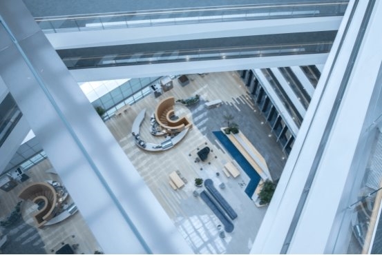 整体建筑由一个“立方体”坐落于底层裙楼之上构成,“立方体”结构为办公区域,裙楼则设有办公配套设施和首层商业空间。退台式花园将自然光引入底部楼层。中庭位于“立方体”结构中心,与户外公共空间实现视觉及空间上的联系。中庭设计充分考虑自然采光,形成鼓励合作的空间氛围,横跨12层挑高空间,设置一系列连廊以连接两侧办公区域 。
