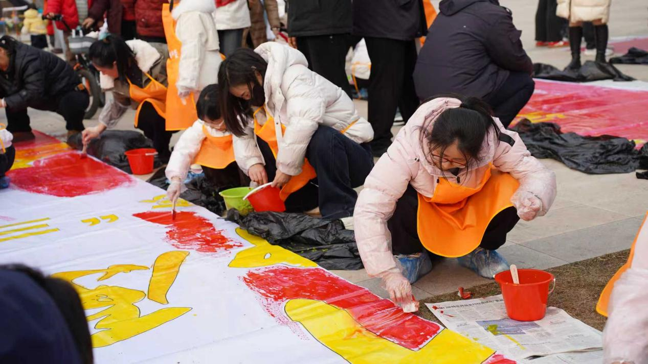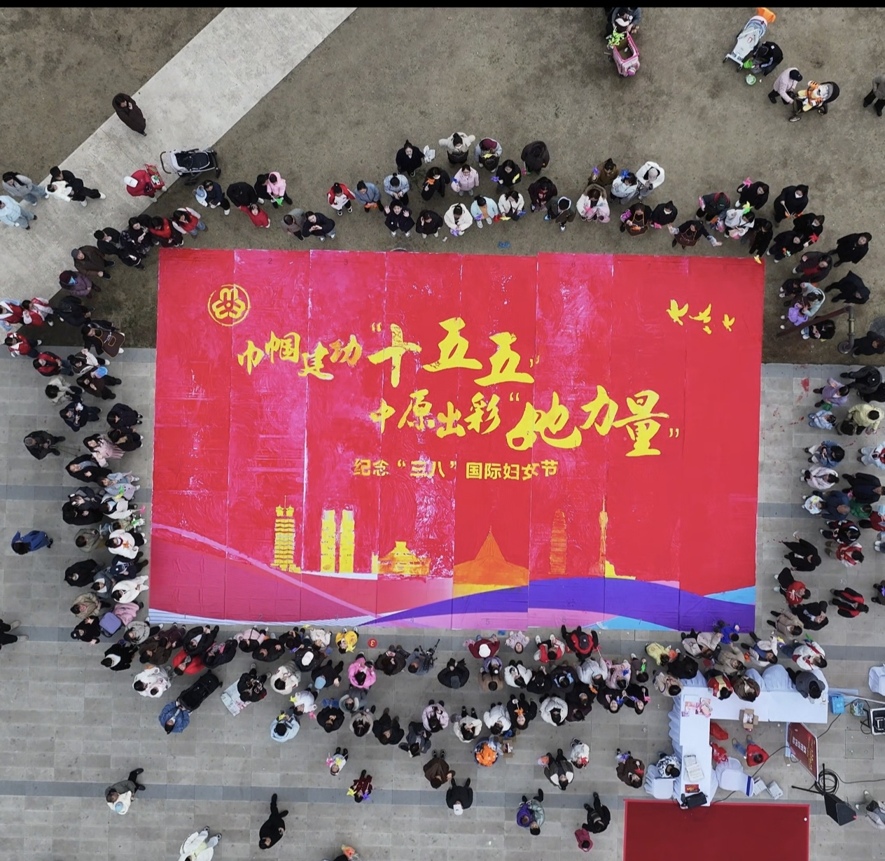 116平方米的巨幅画布上,200多名参与者分工协作、同心绘就。大家以色彩传情、以画笔抒怀,一笔一画勾勒巾帼担当,一抹一色绽放女性风采,共同完成这幅凝聚初心与力量的主题巨作。现场氛围热烈而温馨。活动在悠扬的《花开中国》旋律中定格美好画面。