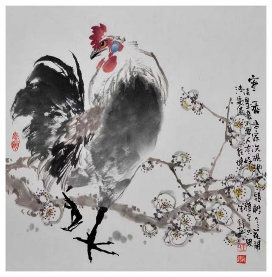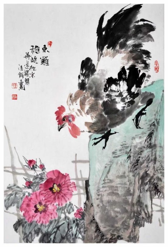 他笔下的花卉,姿态自然、结构明晰,梅兰竹菊、荷莲牡丹、紫藤凌霄、芙蓉等题材,皆能各守品性、各得其韵,不概念、不程式、不流俗。尤其笔下荷花,清润秀雅、气韵生动,于淡宕中见明净,于舒展中见品格,极具辨识度。其笔下禽鸟更是灵动传神,麻雀、翠鸟、喜鹊、鹭鸶等,体态小巧而神气十足,或栖或鸣、或顾盼或欲飞,动态自然、神情鲜活;雄鸡题材尤见功力,昂首挺立、气宇轩昂,精神饱满、神采奕奕,尽显阳刚正气与生命张力,于简练笔墨中写出生命意趣。