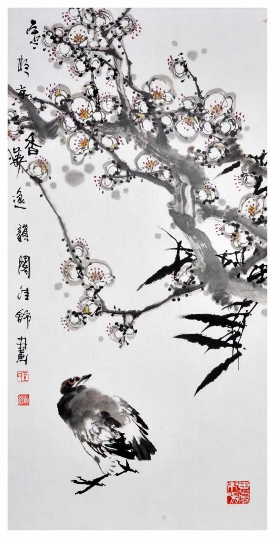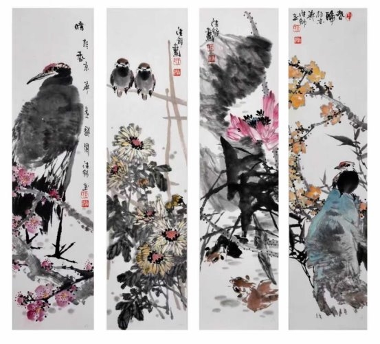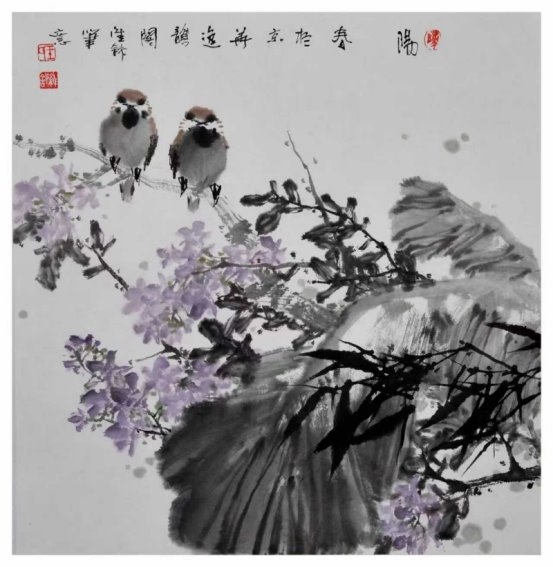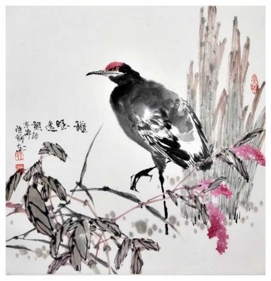 在色彩运用上,他恪守传统“色不碍墨、墨色相生”的法度,设色清雅明快、温润和谐,既赋予画面鲜活生机,又始终以笔墨为骨,不夺其韵、不掩其气。无论是清雅淡彩,还是温润设色,皆点染有度、自然天成,使画面在文气与生机之间达成高度统一,尽显小写意花鸟独有的笔墨意趣与审美格调。