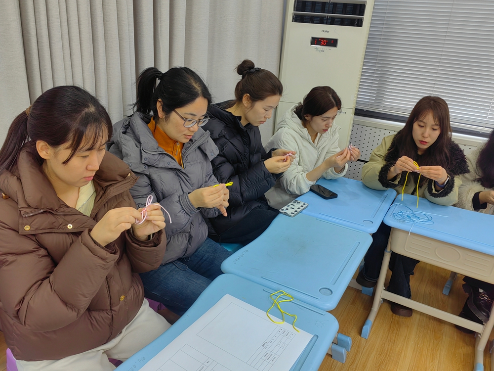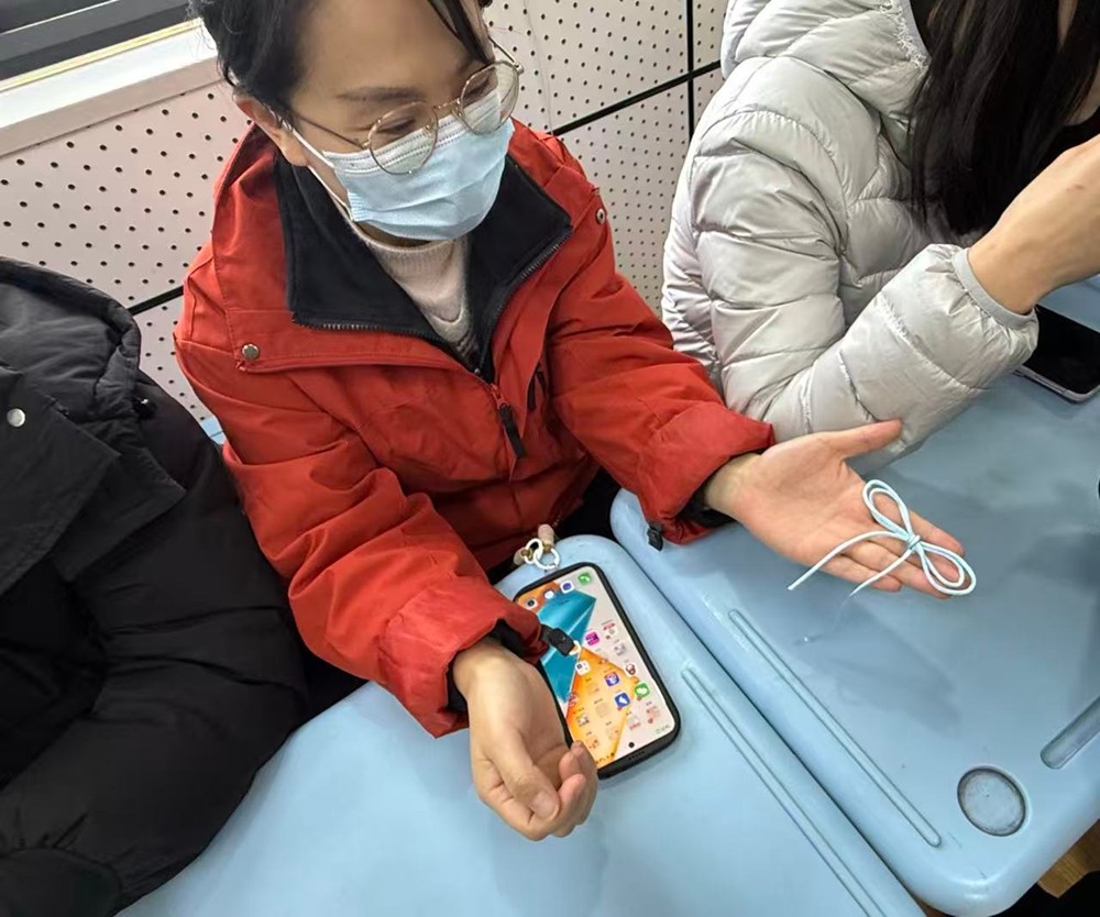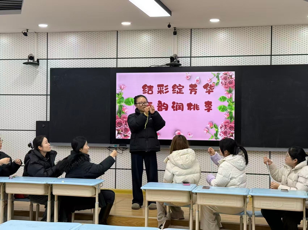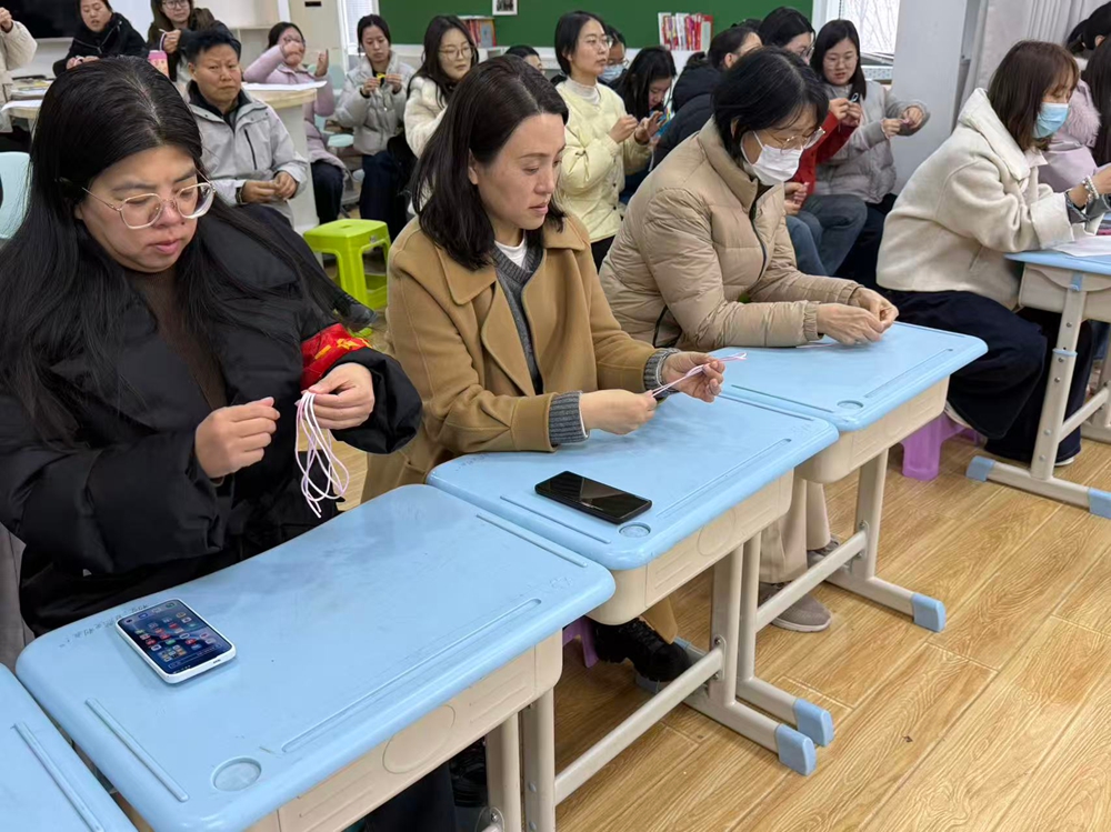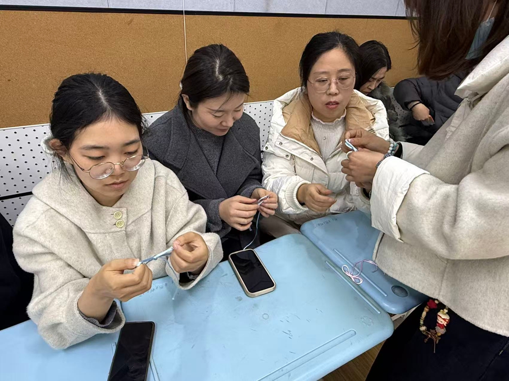 活动现场,工会精心准备了五彩编织线等材料,处处洋溢着温暖祥和的氛围。在指导老师的耐心讲解与示范下,女教职工们认真聆听、专注实践,一步步学习吉祥结的编织技法。穿线、绕线、抽紧、调整,大家专注投入、相互交流、彼此协助,在欢声笑语中感受手工编织的乐趣,现场气氛温馨而热烈。