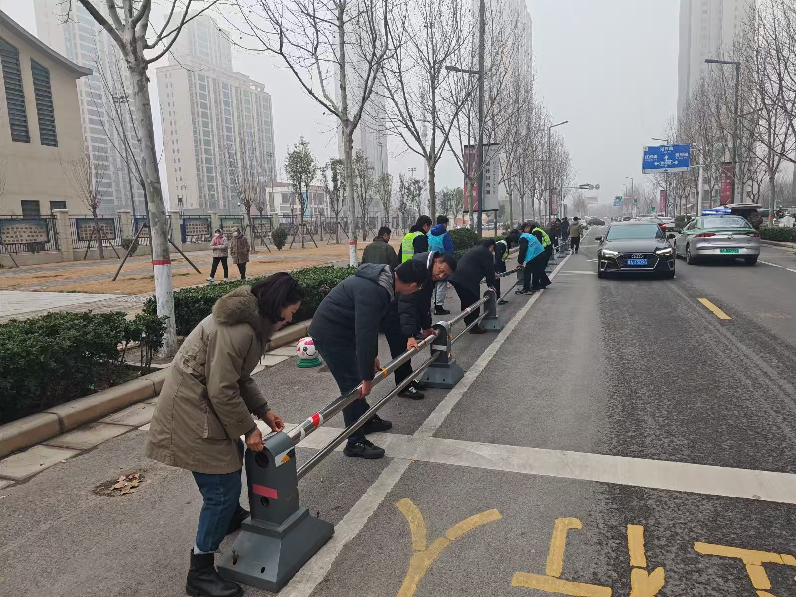 整治现场,多部门工作人员分工协作、同步发力,聚焦校园门前及两侧道路重点区域,对违规停放的机动车逐一进行劝导清理,依法纠正占道停车、随意停靠等行为,及时消除道路通行障碍。针对机动车与非机动车混行、通行秩序混乱的安全隐患,工作人员现场规划、规范施工,在机动车道与非机动车道之间统一安装隔离护栏,通过物理隔离实现人车分流、各行其道,从源头减少剐蹭、拥堵等风险,让校园周边通行更有序、更安全。