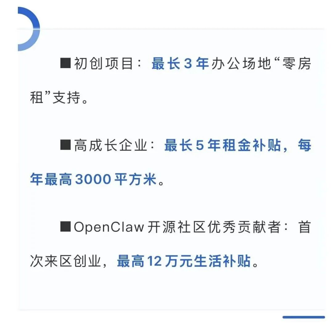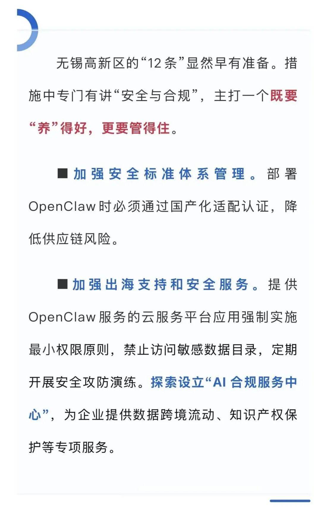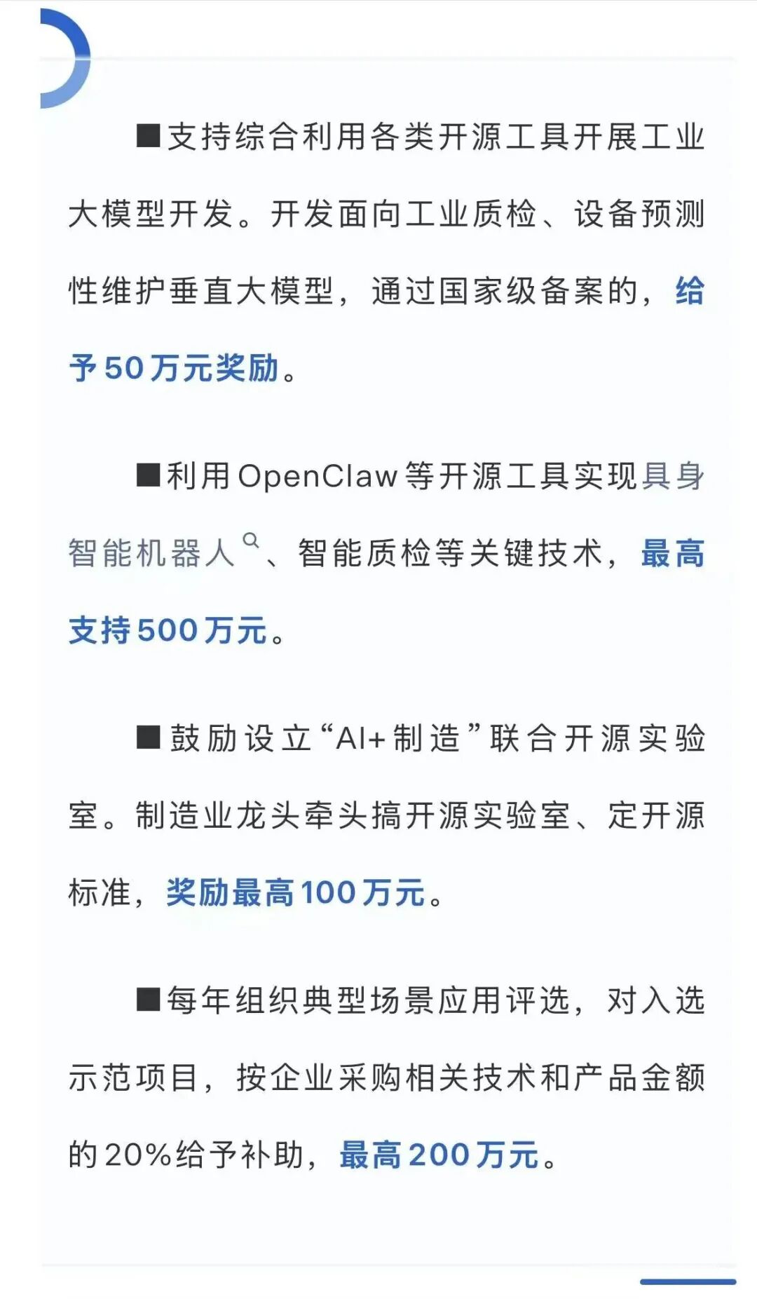 3月9日,无锡高新区在举行的“人工智能+”三年行动计划推进会暨“AI+制造”创新发展大会上,率先发布《关于支持OpenClaw等开源社区项目与OPC社区融合发展的若干措施(征求意见稿)》,共12条措施。其中提到,利用OpenClaw等开源工具实现具身智能机器人、智能质检等关键技术,最高支持500万元。