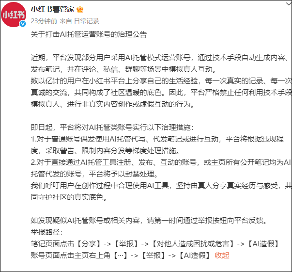 3月10日,@小红书薯管家发布关于打击AI托管运营账号的治理公告。