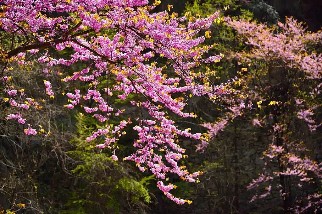 西峡的春天是立体的。老君洞景区内的18万亩野生紫荆花,每年4月至5月竞相绽放,极目远望,满山遍野是一片红色的海洋,蔚为壮观。由于地处伏牛山南坡,垂直高差造就了紫荆花自下而上梯次开放的奇观。景区每年4月初举办“紫荆花节”,今年还推出“花朝节”仙侠主题活动,4月3日至5月1日门票3.2折(18.8元),着汉服可免费入园。