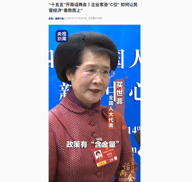 围绕民营经济发展这一时代议题,买世蕊在接受央视记者采访时也道出了基层心声与发展期盼。她表示:“政策有‘含金量’,关键要让企业有‘获得感’,让企业家敢投资、敢创新、敢发展,让大家吃下‘定心丸’,我们的经济一定会更有活力、更有底气、更有希望。”这一话语,既是对营商环境优化的真切期待,也为民营经济发展注入了信心。