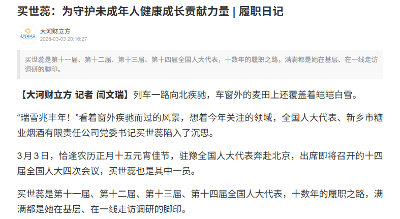 未成年人健康成长是买世蕊多年来持续关注的核心领域。在接受大河财立方记者采访时,买世蕊介绍,2023年11月,“买世蕊小荷工作站”正式成立,以此为依托,她深度参与新乡市未成年人检察保护工作,在预防未成年人犯罪、被害人救助、未成年人法治实践等方面持续发力,成为守护未成年人的“护苗人”。2026年两会,买世蕊再次聚焦这一议题,呼吁进一步构建政府、学校、家庭、社会协同发力的全链条保护格局,凝聚多方力量,为未成年人的健康成长撑起“保护伞”。