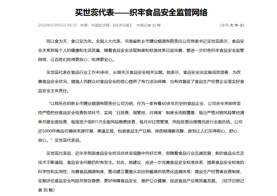 针对食品安全领域,买世蕊在接受中国经济网记者采访时,结合自身深耕食品酒类行业的从业背景,提出多项具体建议。她认为,应进一步完善食品安全标准体系,提高食品安全标准的科学性和实用性;完善食品溯源制度,推动建立覆盖从农田到餐桌的信息化追溯体系;增设生产经营者自查制度,定期评估食品安全风险并报告隐患,更好保障食品安全,维护公众健康,促进食品产业高质量发展。