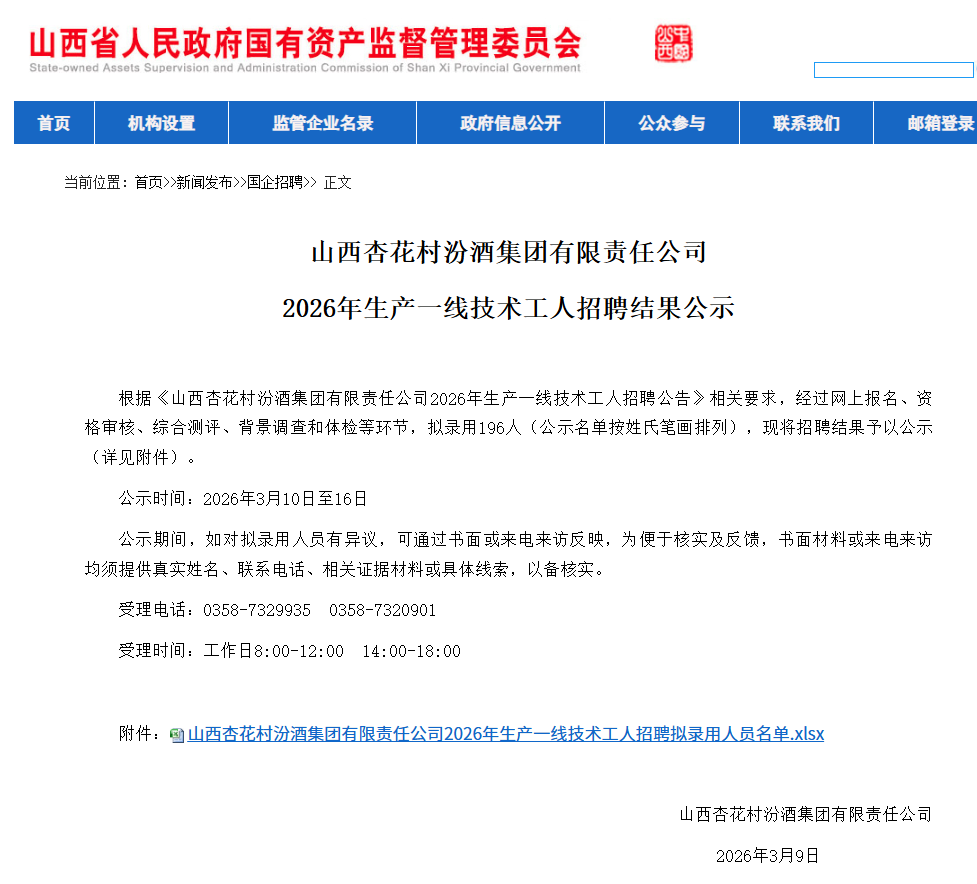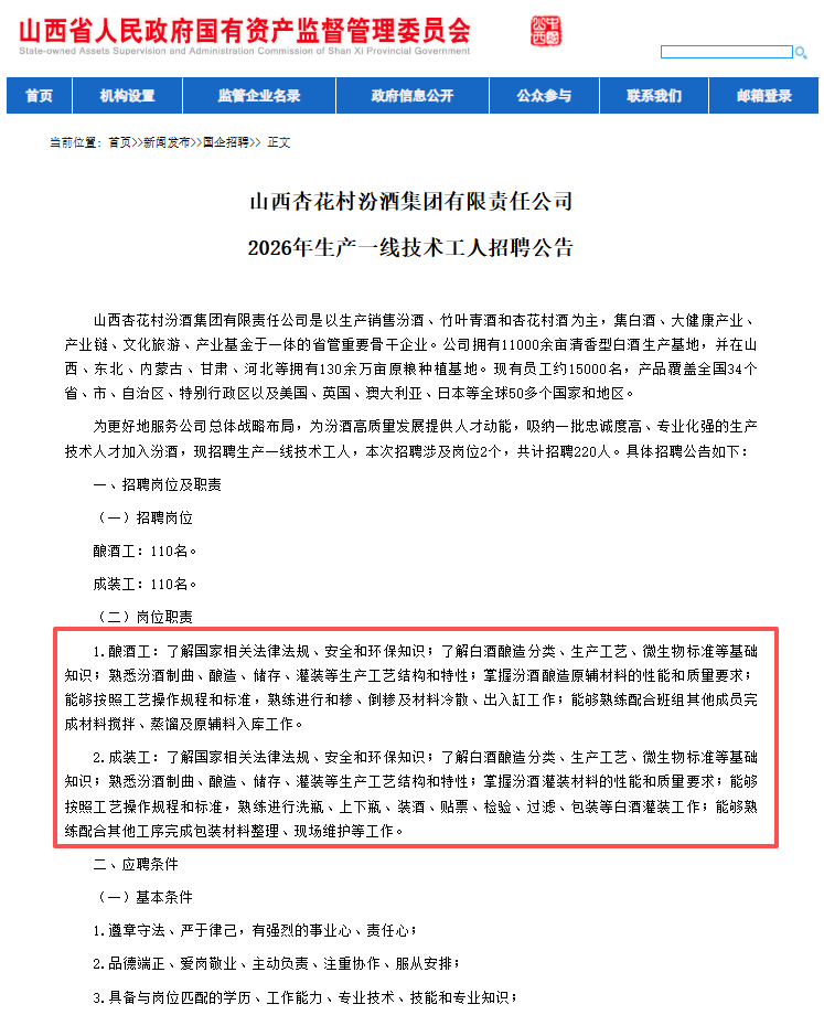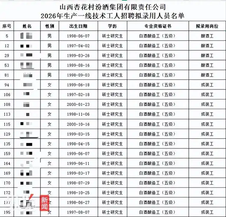 近日,山西杏花村汾酒集团公示了2026年生产一线技术工人招聘拟录用人员名单。在酿酒工和成装工岗位中,出现了19名硕士研究生,引发广泛关注。
